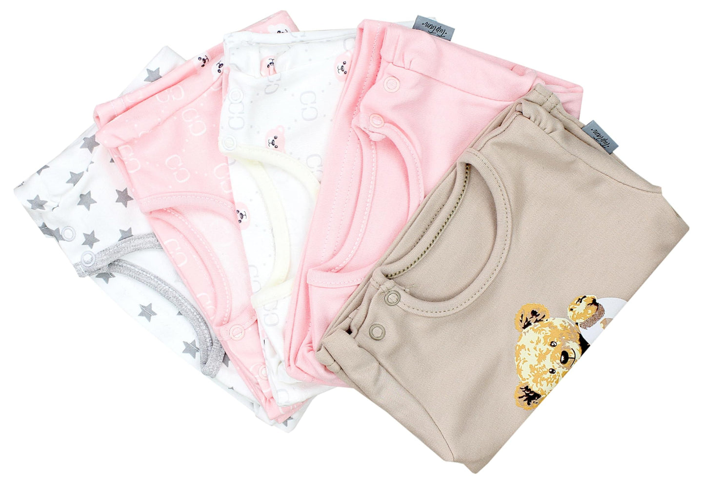 • Im Set: 2 Shirts einfarbig (Hellrosa, Puderrosa oder Gelb, Rosa) und 3 Shirts mit Print ( Zebra, Bärchen, Sommerfrüchte oder Koala, Kirschen, Blumen)