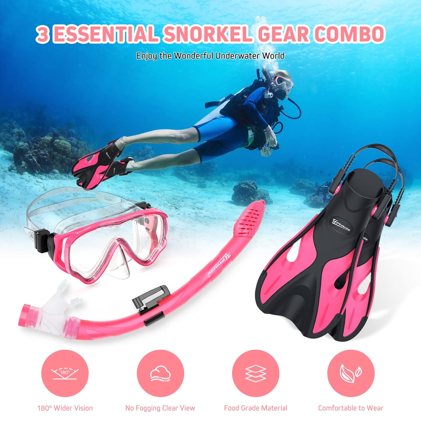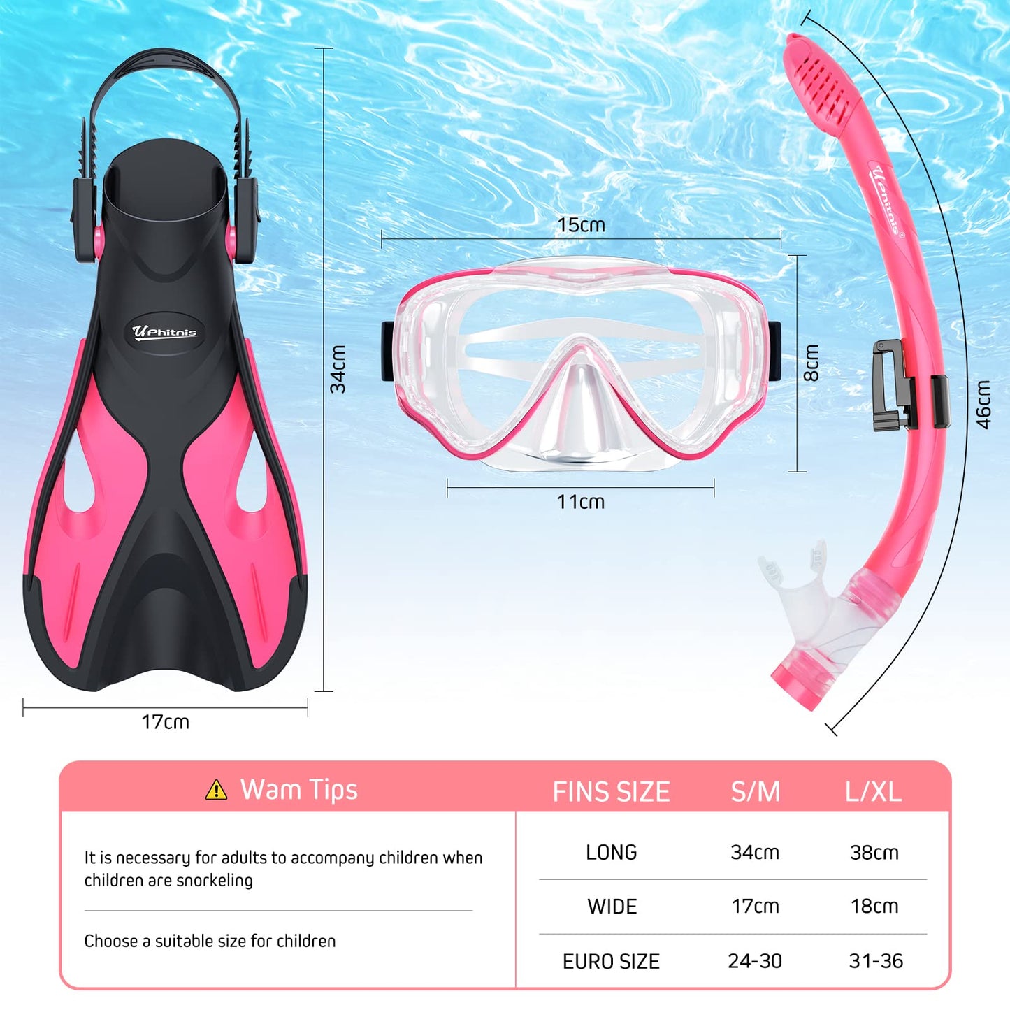 UPhitnis Kinderschnorchelset mit Flossen, Antibeschlag 180° Panorama Taucherbrille, verstellbare Schwimmflossen und Premium Dry Schnorchel, 3-in-1 Schnorchelset für Kinder mit Tragetasche