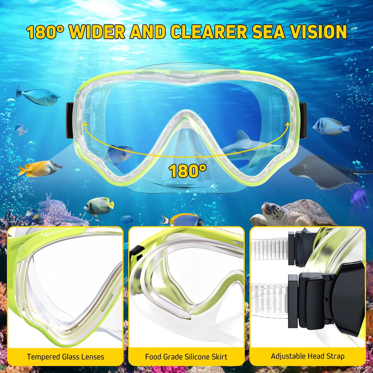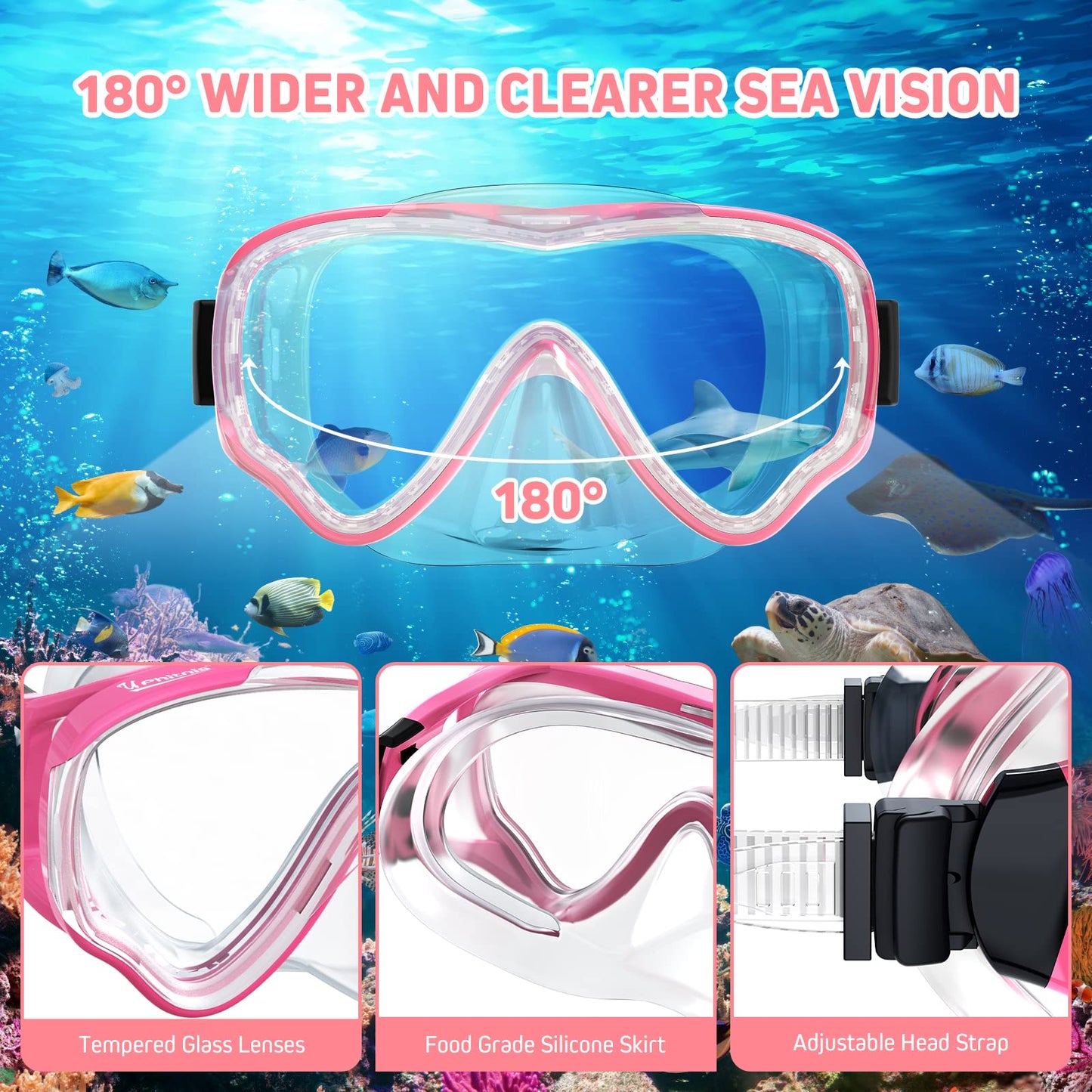 Der 180° Panorama Blick der Taucherbrille sorgt für ein erweitertes Sichtfeld und ein unvergleichliches Schnorchelerlebnis. Anti-Beschlag-Technologie garantiert, dass die Sicht klar bleibt, während die Kinder die Schönheit des Meeres bewundern.