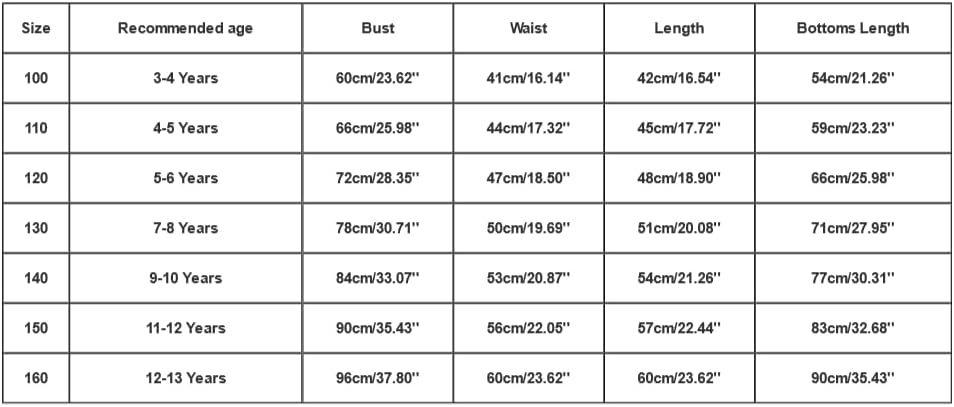 Empfohlenes Alter:9-10 Jahre Büste:84cm/33.07'' Taille:53cm/20.87'' Länge:54cm/21.26'' Hosenlänge:77cm/30.31''
