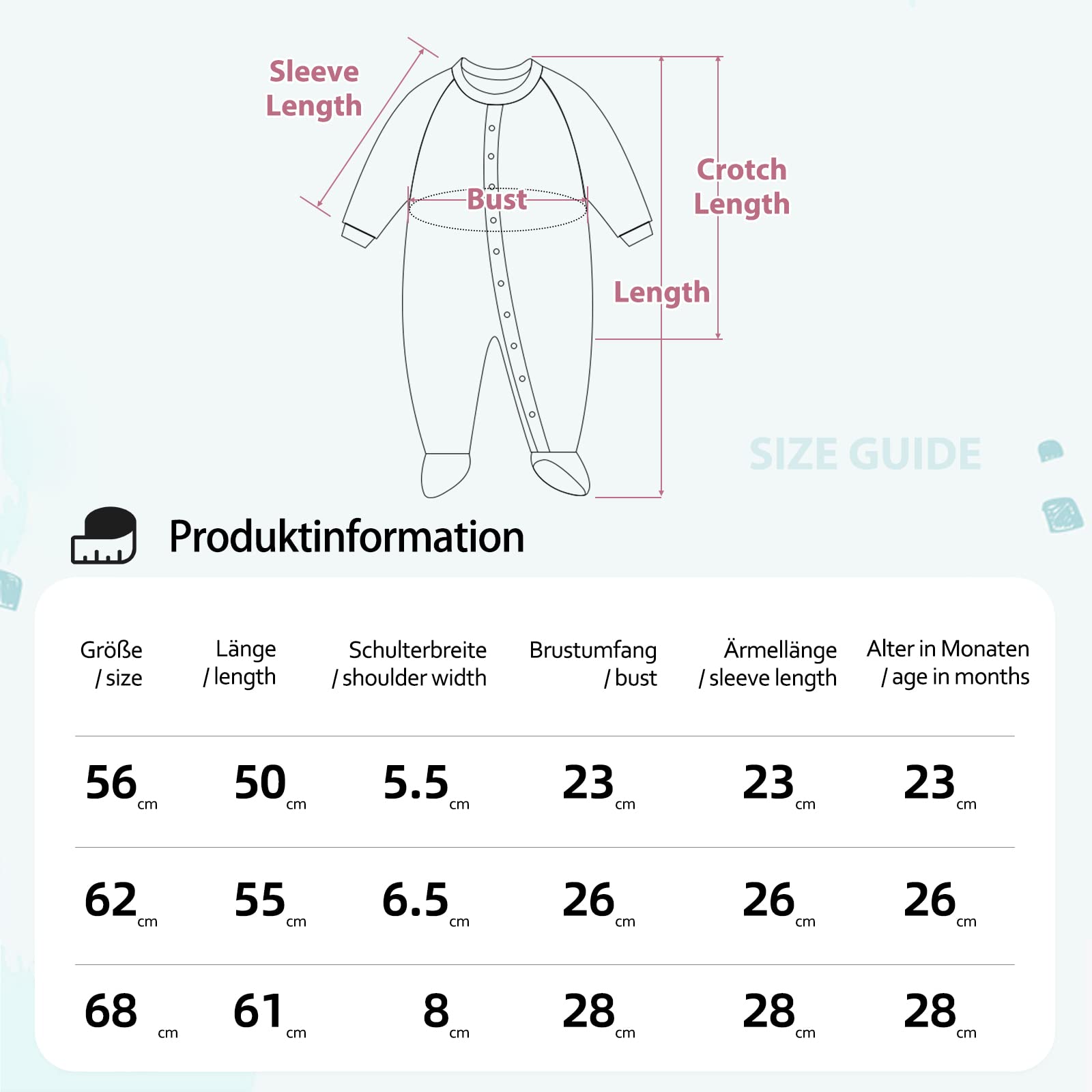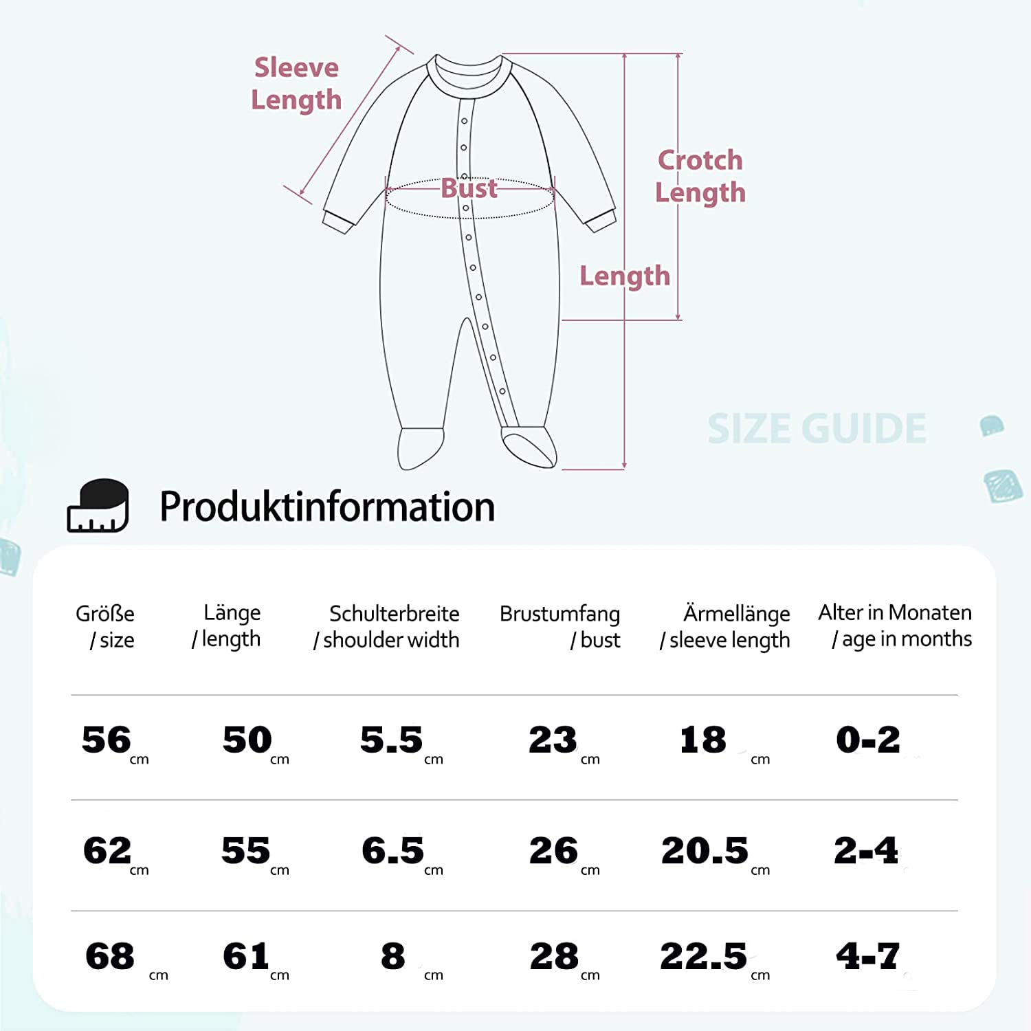 • OPTIMALE GRÖSSE - Es gibt drei Auswähle zu 56, 62, 68, die Größe 56 (Länge: 50cm Schulter: 5,5cm Brustumfang: 23cm Ärmelslänge: 18cm)ist geeignet für das Neugeborene von 0 bis 2 Monate alt, die Größe 62(Länge: 55cm Schulter: 6,5cm Brustumfang: 26cm Ärmelslänge: 20,5cm) passt für das Baby von 2 bis 4 Monate alt und die Größe 68(Länge: 61cm Schulter: 8cm Brustumfang: 28cm Ärmelslänge: 22,5cm) passt für das Baby von 4 bis 7 Monate alt.