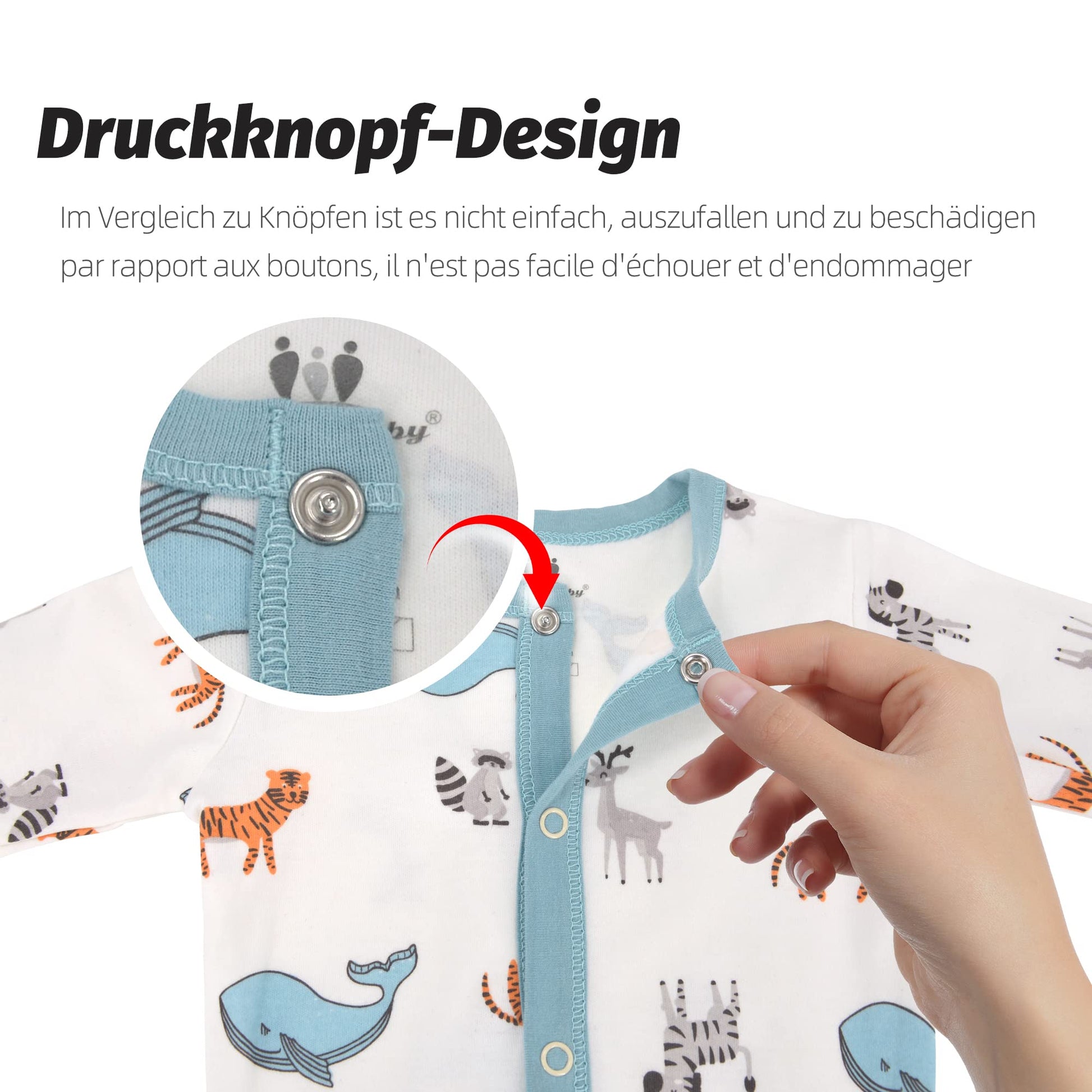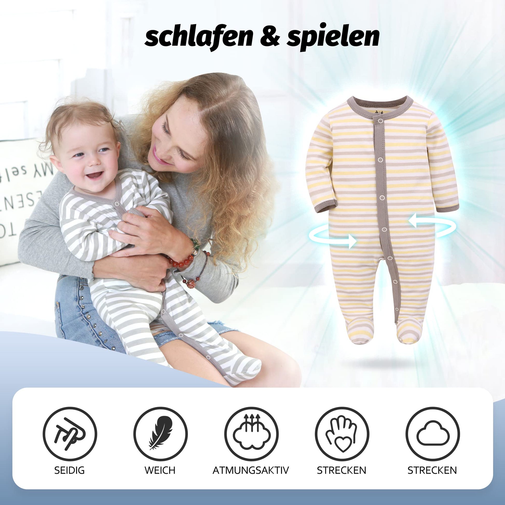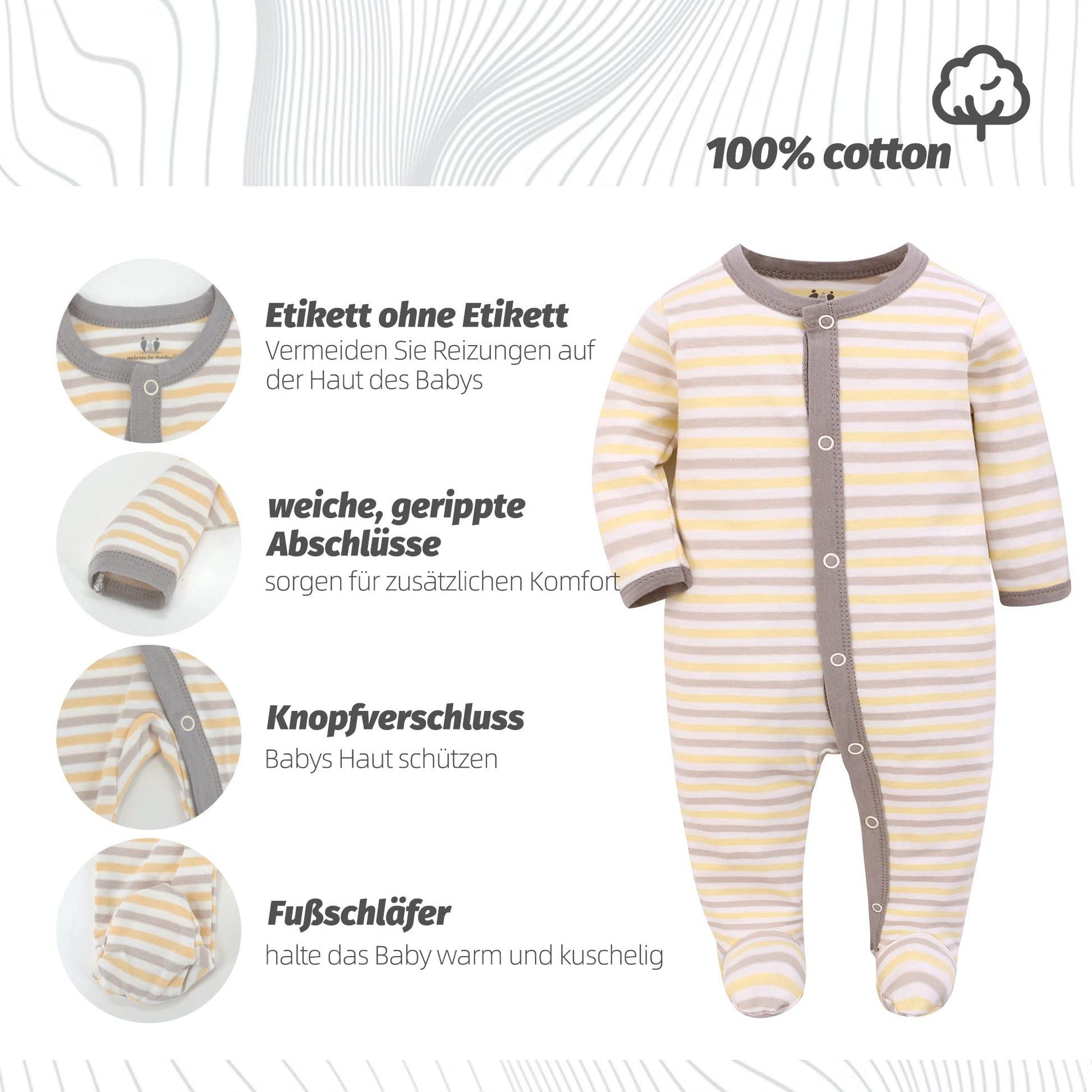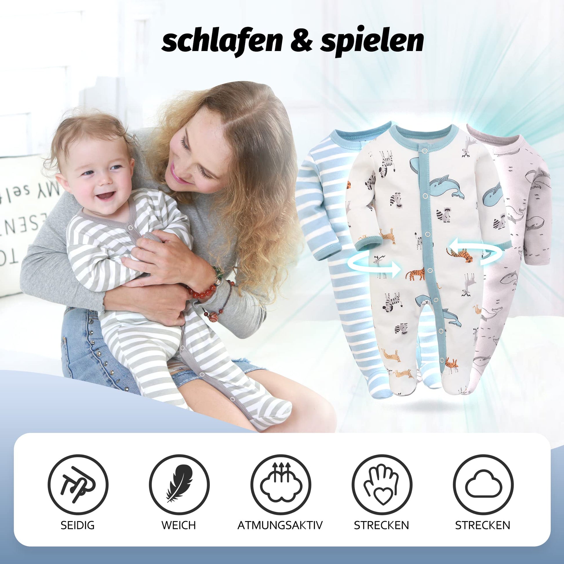 3PCS Baby Schlafstrampler Babychlafanzug Babyschlafsack Baumwolle mit Füßen mit knöpfen Gr. 56 62 68 für Junge Mädchen Neugborenen