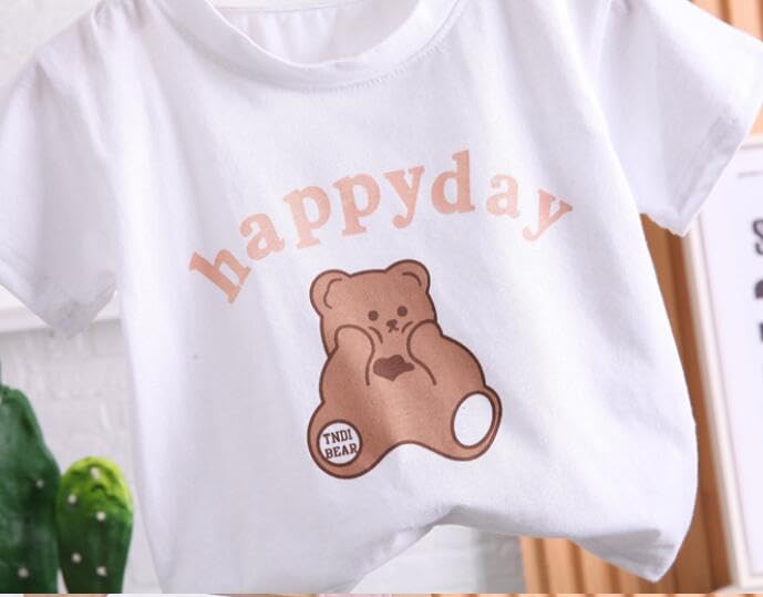 • 💖 Kinder Weiße T Shirt mit süßem Bärenaufdruck und "Happy Day“-Schriftzug, Rundhalsausschnitt und kurzen Ärmeln .
