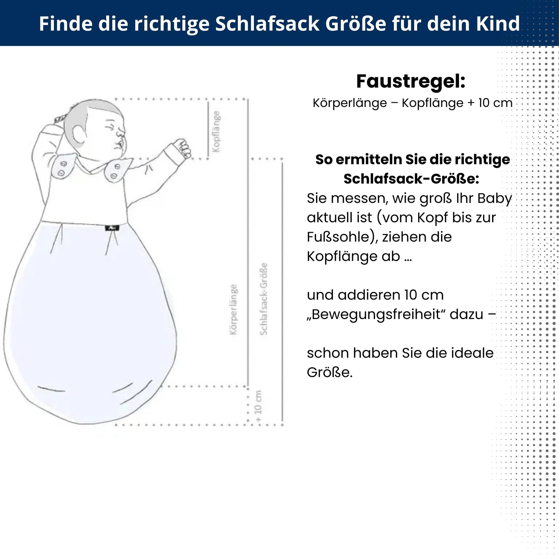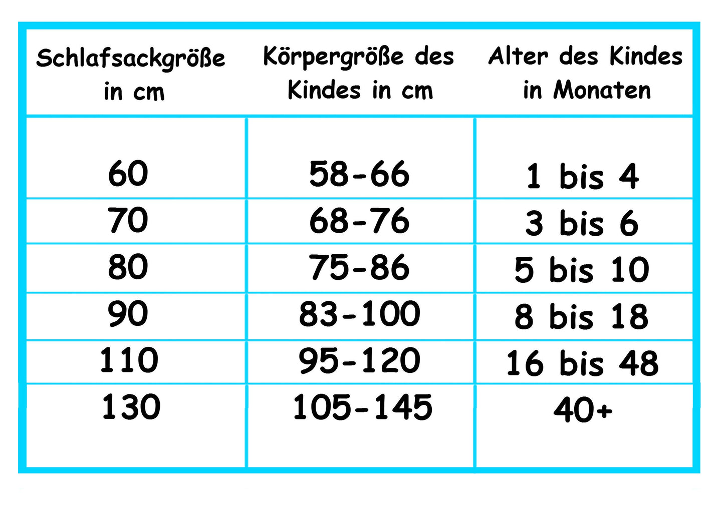 Correct size sleeping bag: measure the length of the baby from shoulder to foot and then + 10 cm, no longer as the sleeping bag is rather larger.