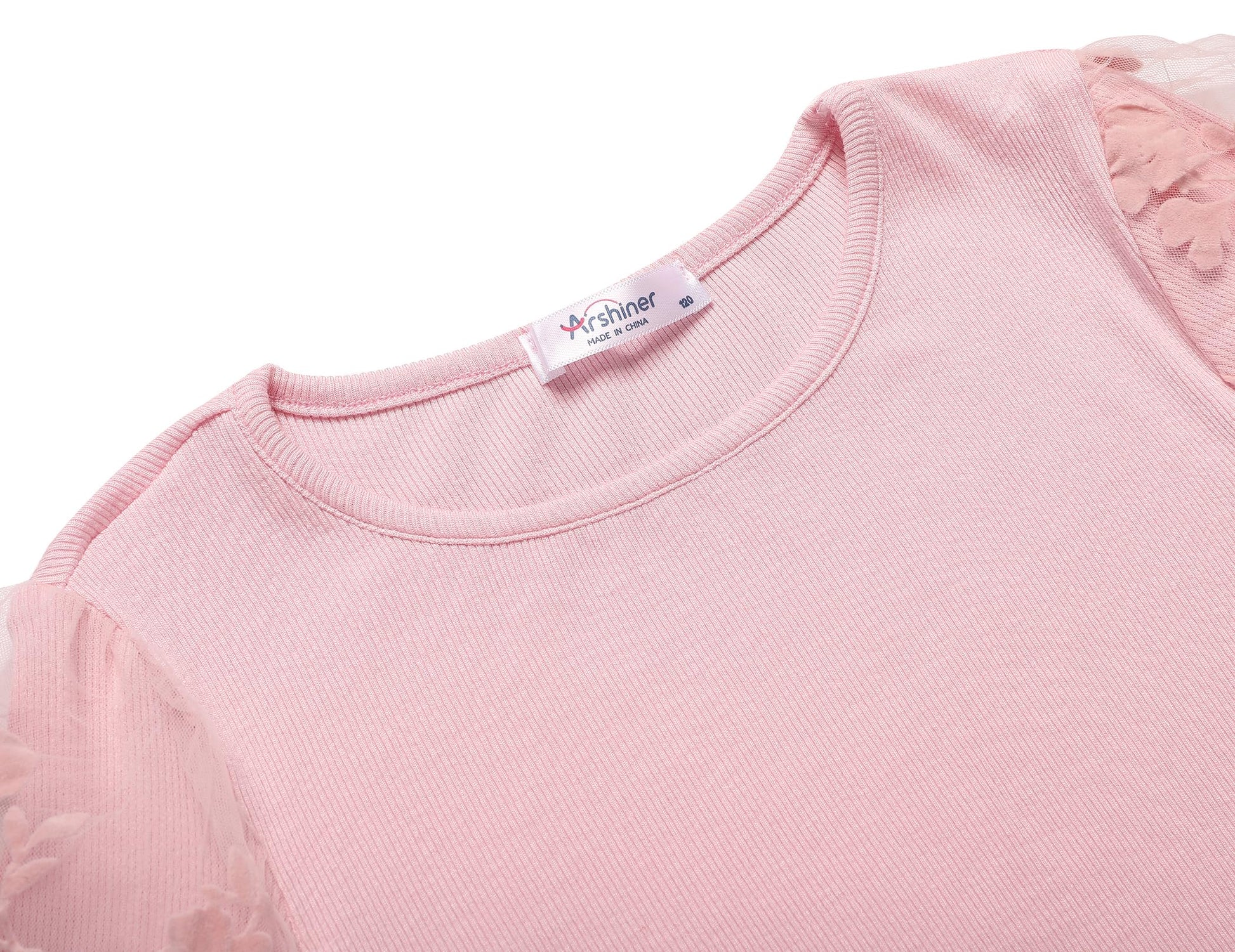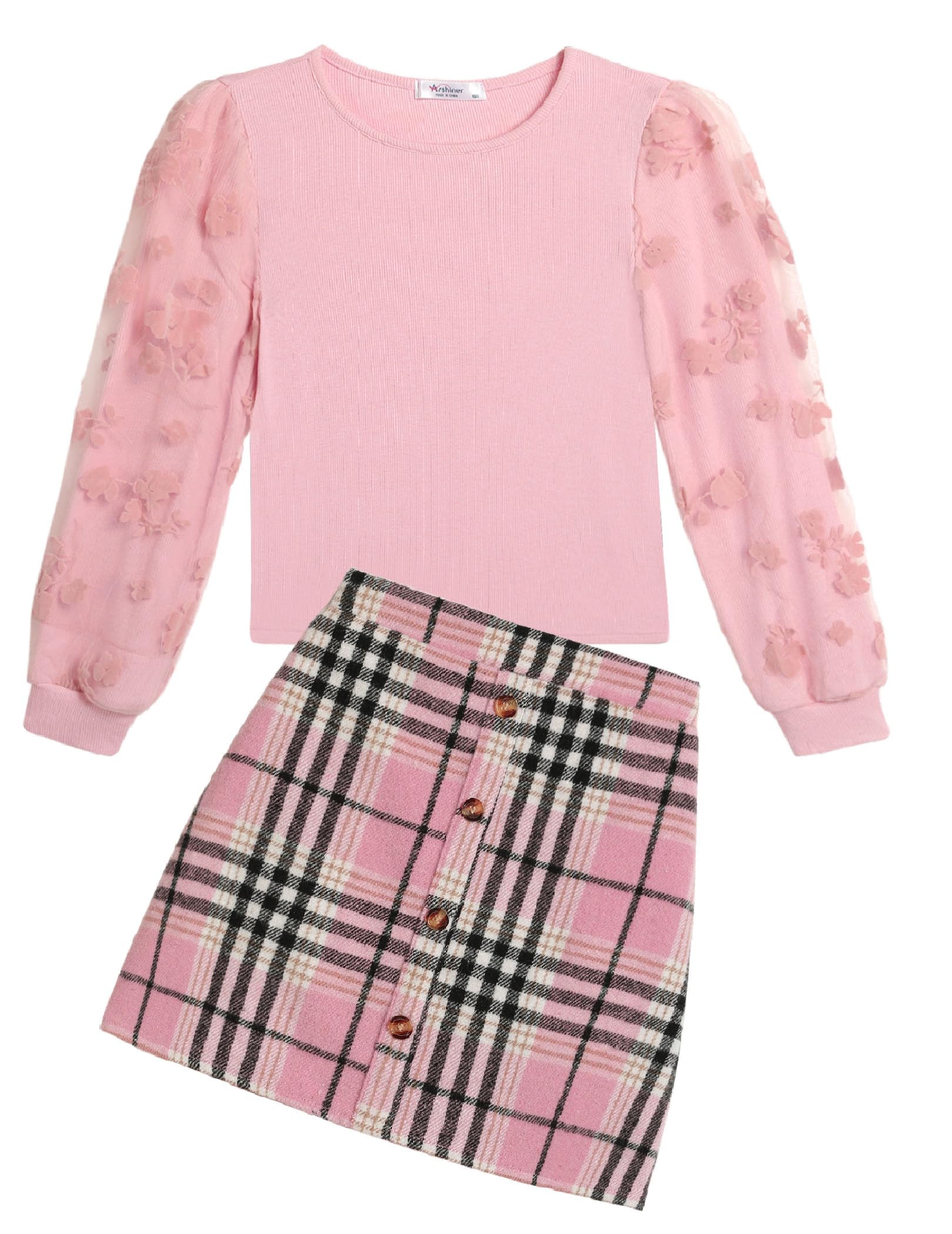 • Checked skirt set: Arshiner girls' clothing sets consists of a long-sleeved shirt and a skirt. The top has pretty floral mesh sleeves and is paired with a checked skirt for a refined and elegant look for your child.