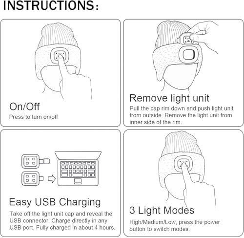 • USB WIEDERAUFLADBAR:Diese LED ohrenklappen mütze verfügt über 4 integrierte LED-Lampen.Sie kann leicht entfernt und aufgeladen werden, indem Sie sie vorsichtig vom Hut zurückdrücken, die Schutzabdeckung des USB-Anschlusses abziehen und den USB Stecker in eine beliebige USB-Steckdose stecken.Das rote Licht leuchtet, wenn der Ladevorgang beginnt, und das grüne Licht leuchtet, wenn der Ladevorgang abgeschlossen ist. Nach 2 Stunden Ladezeit erhalten Sie eine helle Mütze, so hell wie eine Stirnlampe.
