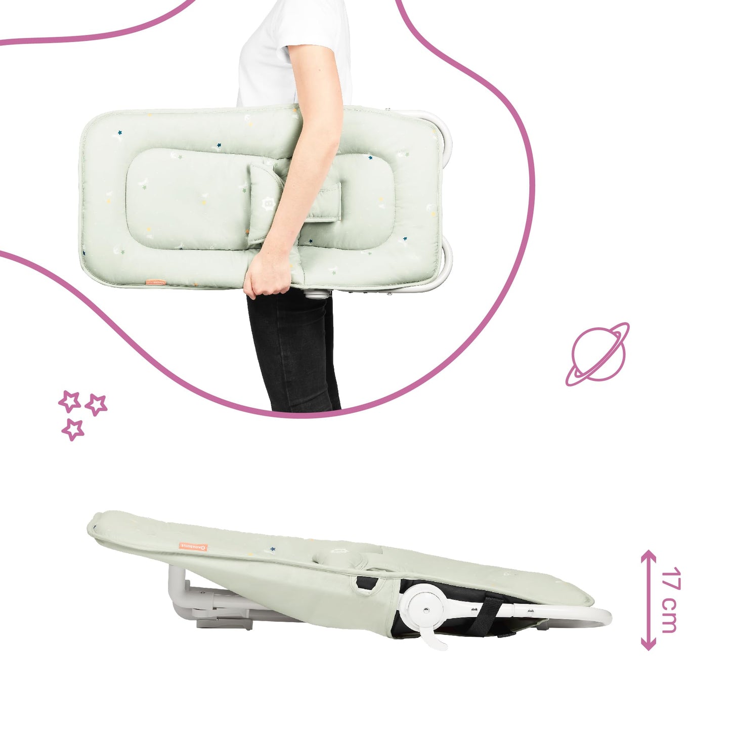nDie Babywippe ist leicht zu benutzen und zu transportieren und lässt sich zur optimalen Aufbewahrung zusammenklappen. Ob zu Hause oder im Kofferraum, sie nimmt keinen Platz weg! Schluss mit Ausflügen mit jeder Menge Gepäck!