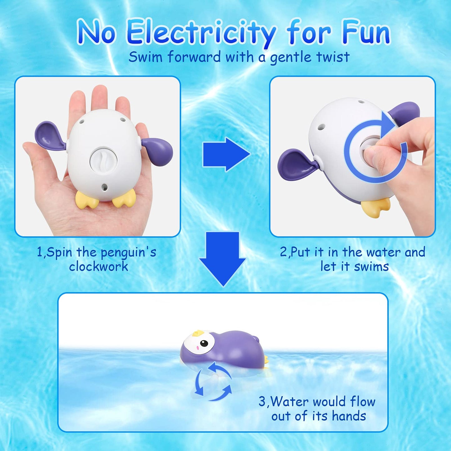• 🐢 🐧【Glücklich Baby Badezeit】- Uhrwerk angetrieben! Keine Batterien erforderlich. Drehen Sie den Griff unter dem Spielzeug im Uhrzeigersinn und lassen Sie ihn dann los. Die Schildkröte oder der Pinguin schwimmen schnell im Wasser um Ihre Kinder herum. Mit schwimmenden Badespielzeugen können Ihre Kleinen Spaß beim Baden haben!