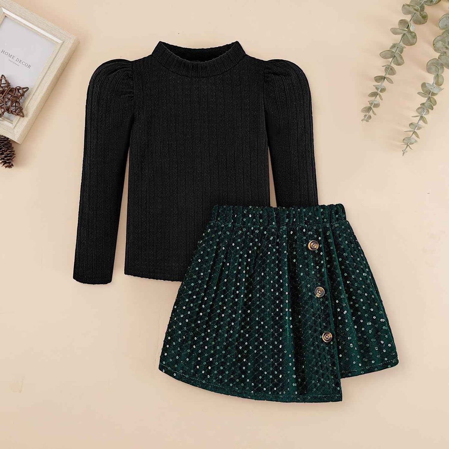 Toddler Girls Skirt Set Puff Sleeve Knitted Shirt and Bling Mini Skirt 2-Piece Clothing Set