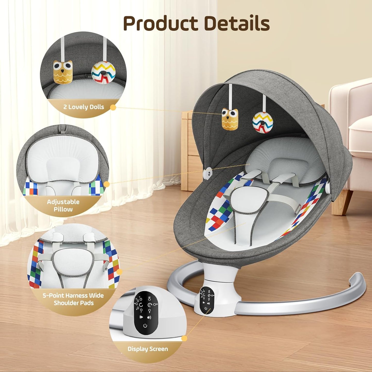 Bluetooth Elektrische Babyschaukel, Upgrade 5-Punkte Geschirr Elektrische Babywippe mit 5 Geschwindigkeiten 3 Timer und 10 Musik, Mobiler APP/Fernbedienung/IMD Panel-Steuerung Babywippen (Dunkelgrau)