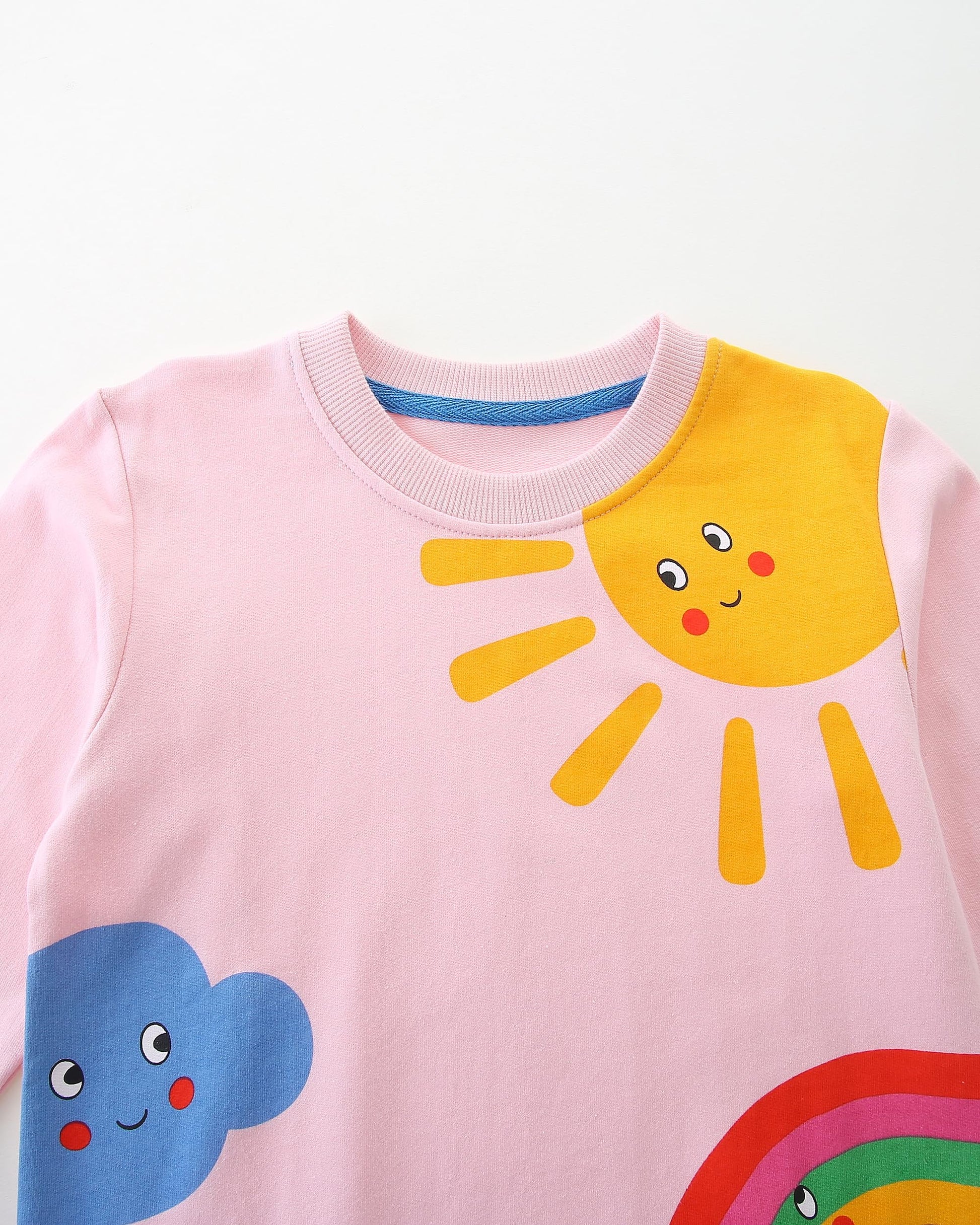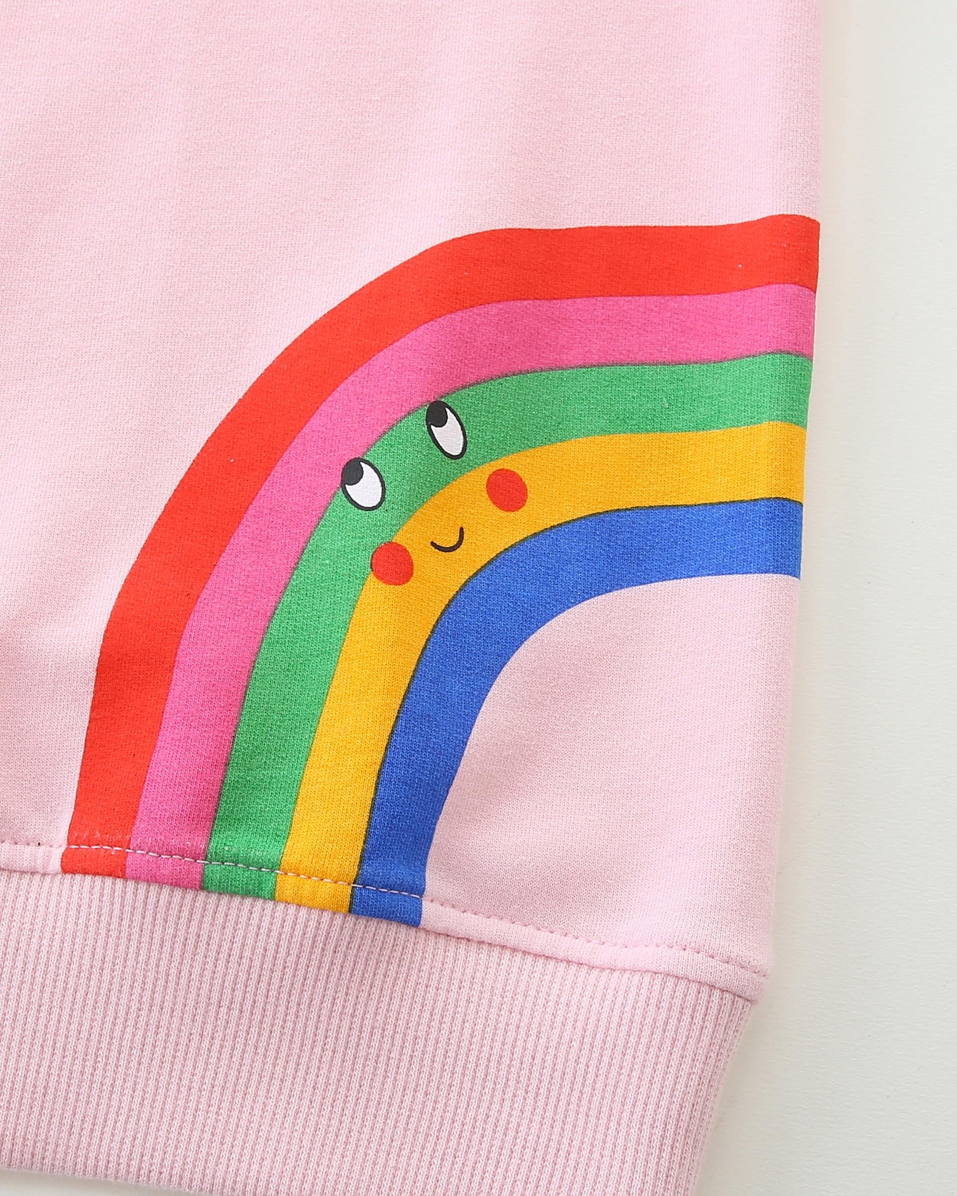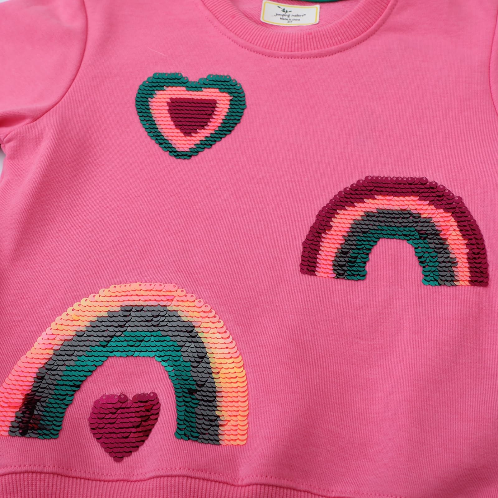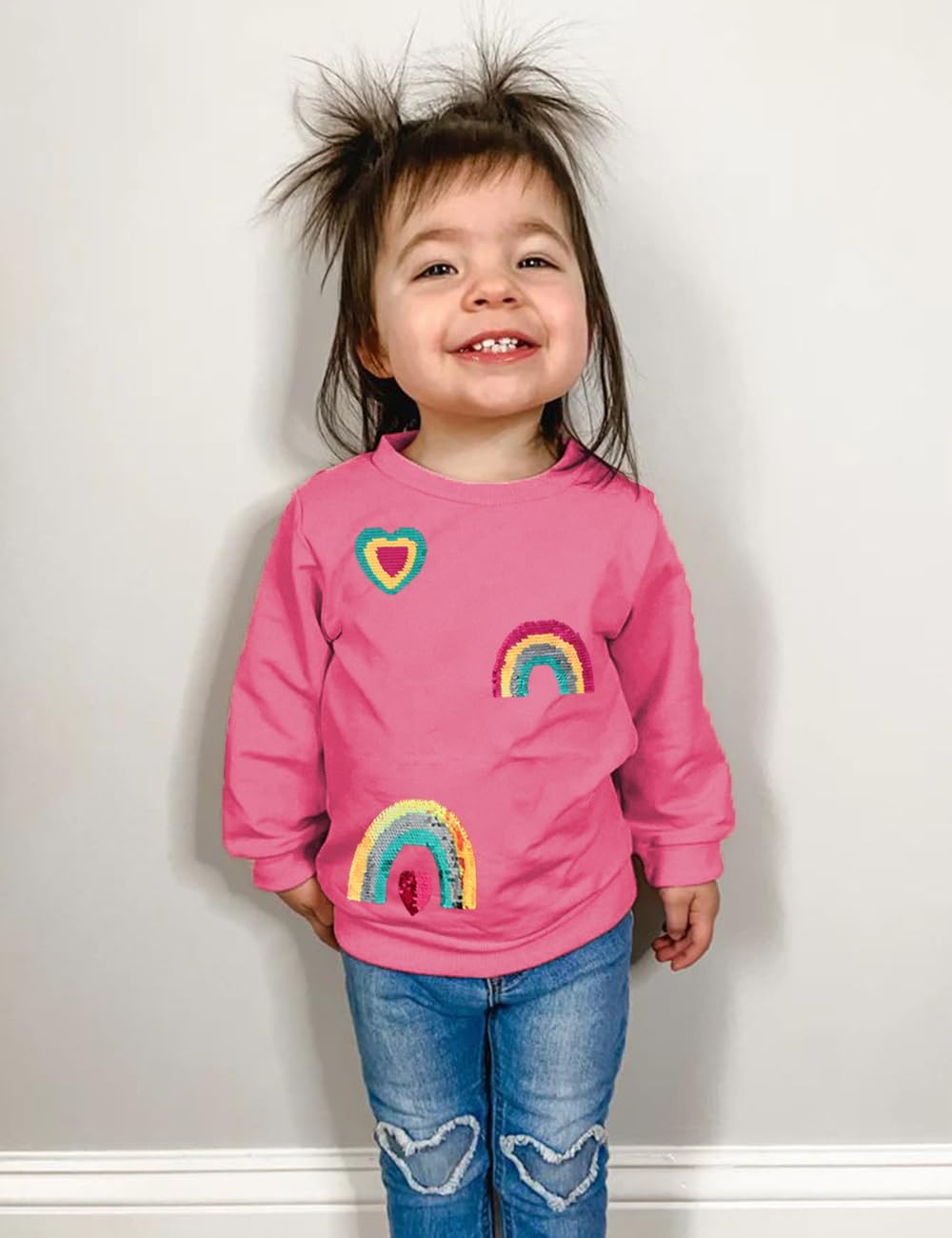 Rosafarbene Langarmshirts für Kinder mit farbenfrohen Grafikdesigns. Eines zeigt Regenbogen- und Herzmotive, das andere ein paillettenbesetztes