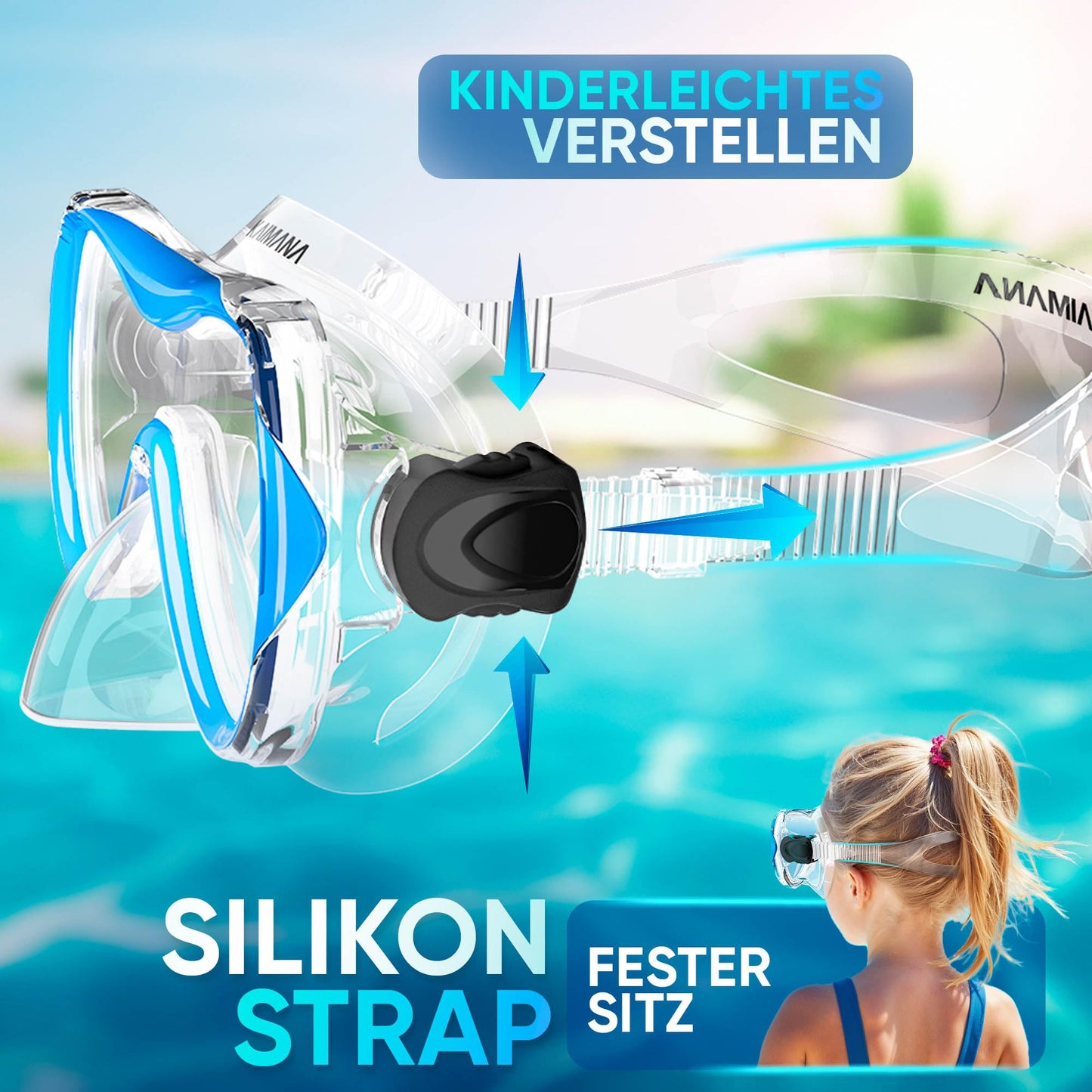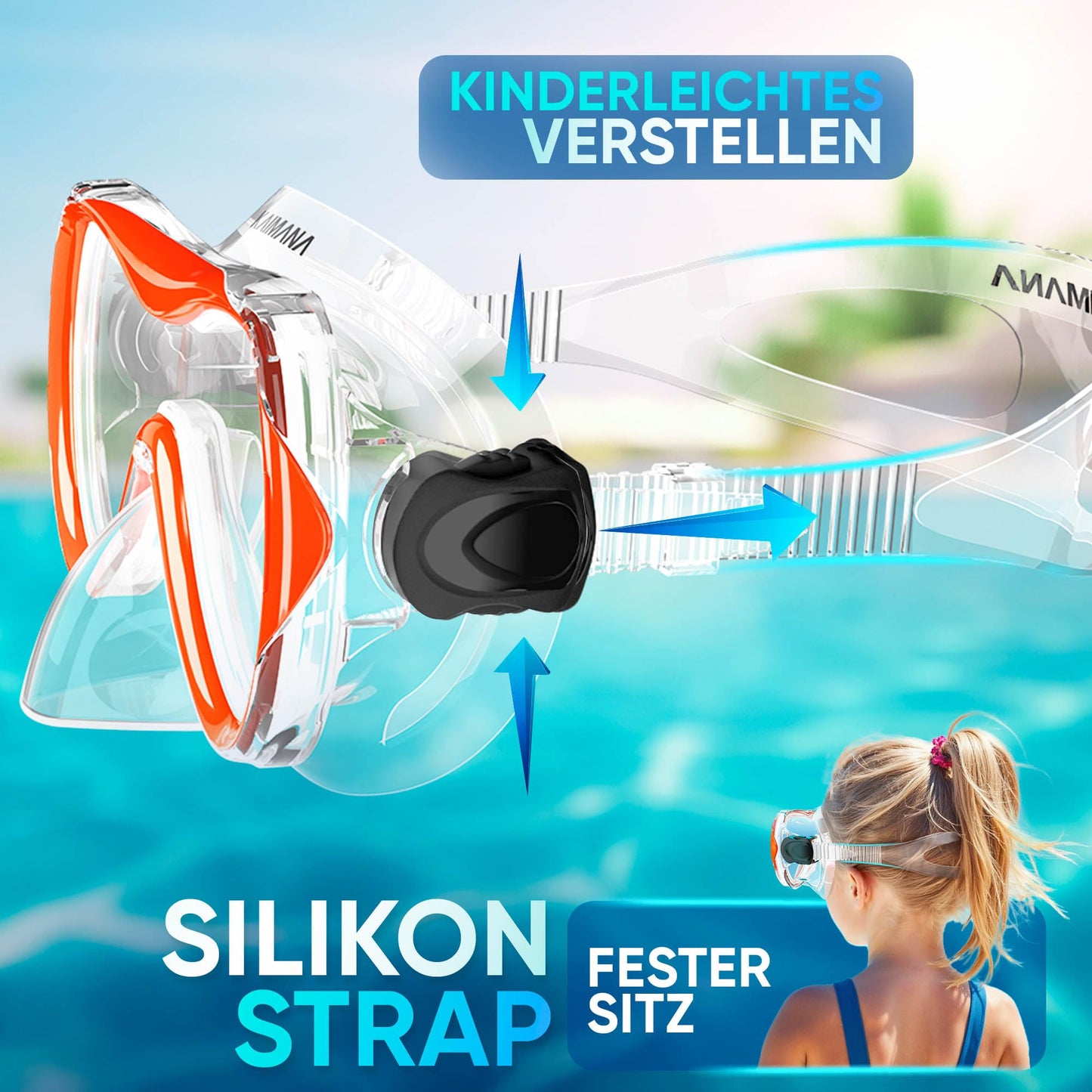 • Eine speziell designte Taucherbrille für Kinder, die eine klare Sicht unter Wasser gewährleistet.