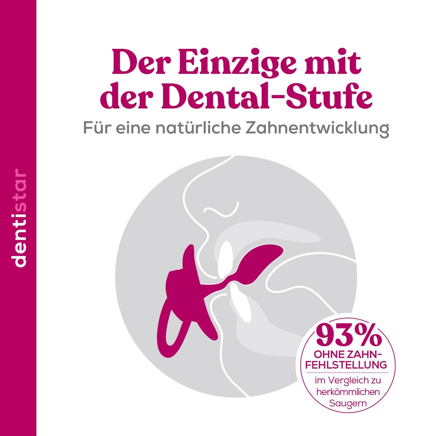 • Zahn- & kiefergerecht – Dank der Dentistar Dental-Stufe vermindert der Silikon Schnuller den Druck auf Kiefer und Zähne um 90%*** und verhindert nachweislich Zahnfehlstellungen*.