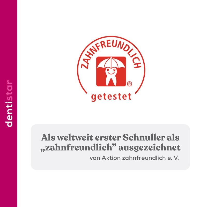 • Zahn- & kieferfreundlich – Dank der dentistar Dental-Stufe vermindert der Babyschnuller den Druck auf Kiefer und Zähne und verhindert nachweislich Zahnfehlstellungen – 93% ohne Zahnfehlstellung*.