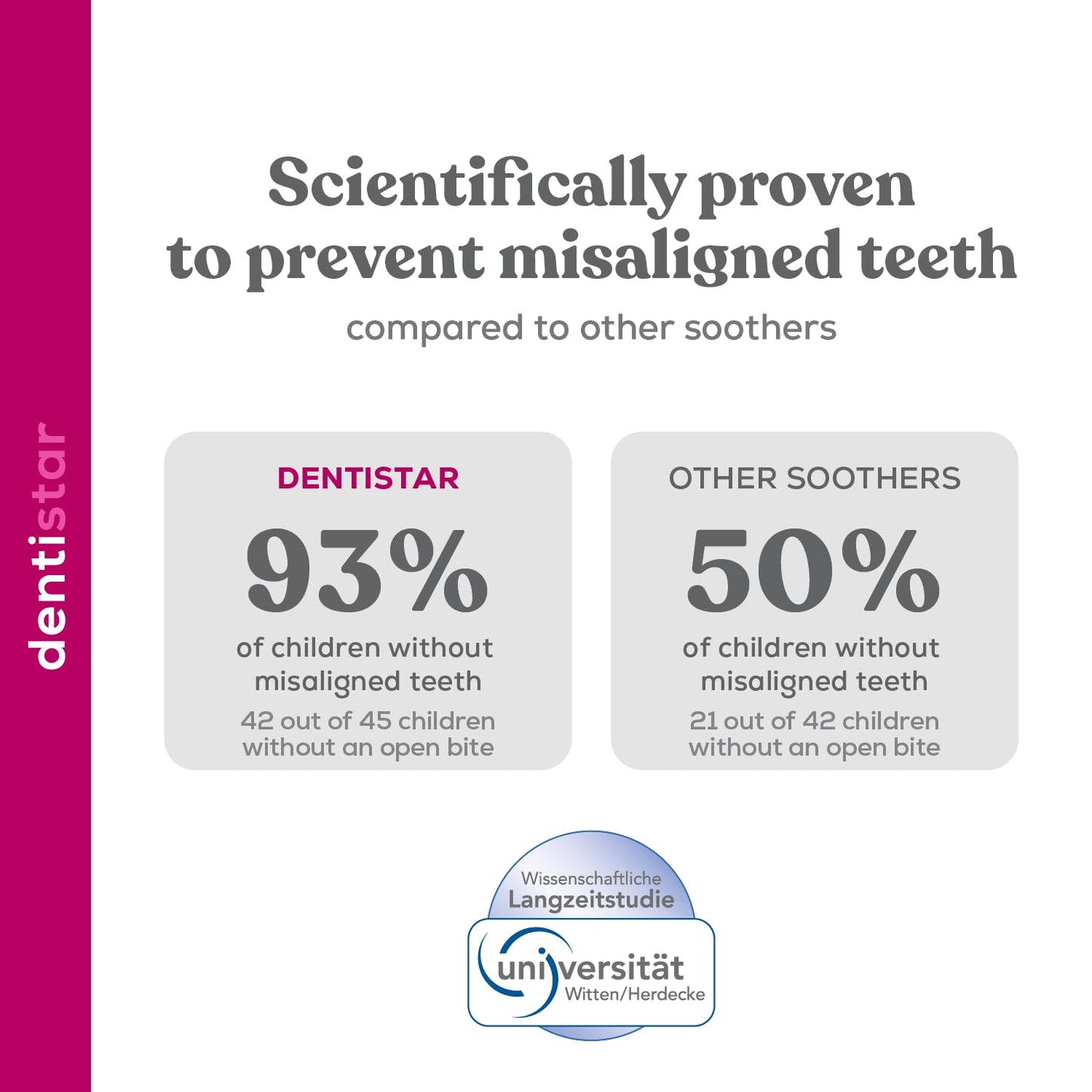 • Zahn- & kieferfreundlich – Dank der Dentistar Dental-Stufe vermindert der Silikon Schnuller den Druck auf Kiefer und Zähne um 90%*** und verhindert nachweislich Zahnfehlstellungen*.
