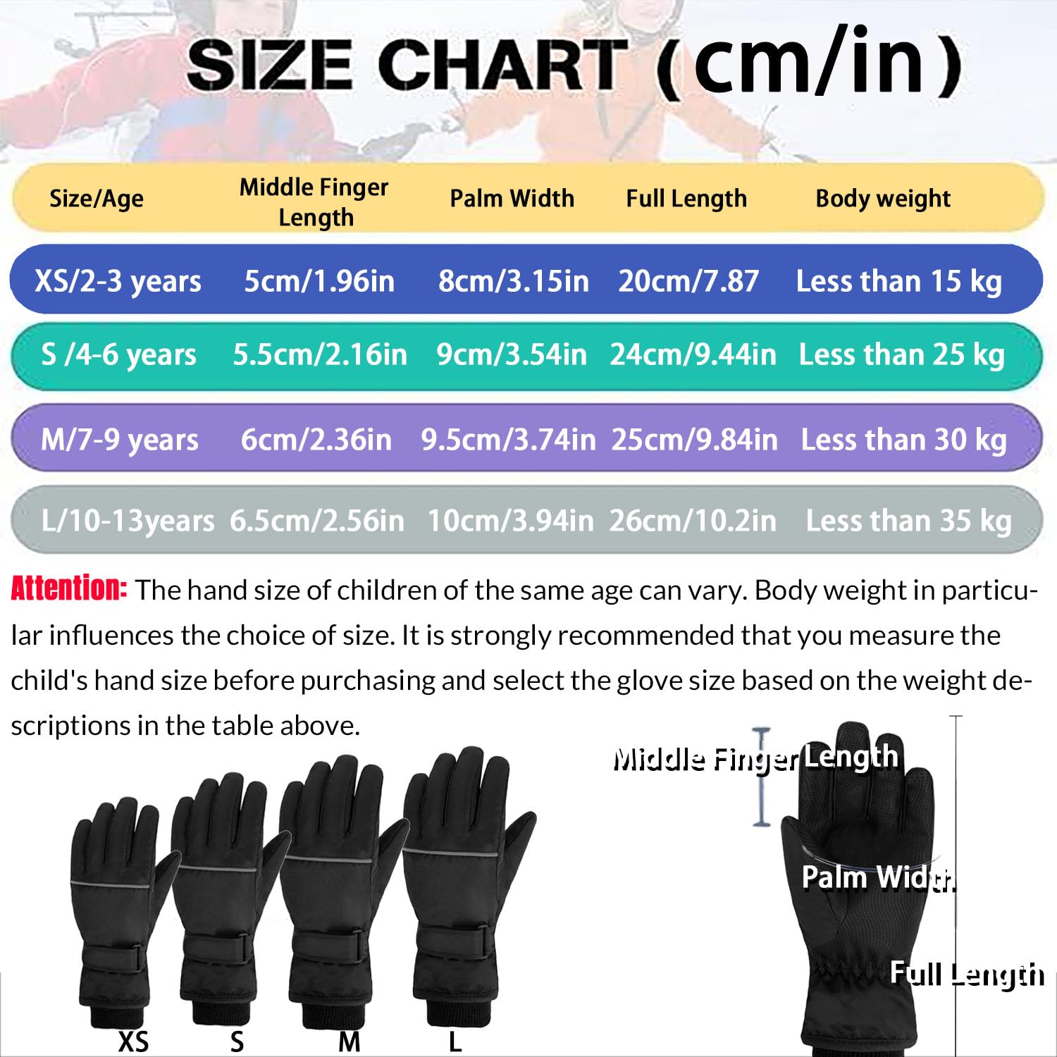 - Suitable for children aged 2-13 years: A great gift for boys and girls when winter comes: XS (2-3 years): 8 cm across the palm, 20 cm total length.S (4-6 years): 9 cm across the palm, 24 cm total length.M (7-9 years): 9.5 cm across the palm of the gloves, 25 cm in total. L (9-13 years): 10 cm across the palm of the gloves, 26 cm total length; leave 0.2 inches extra space for the cushion when measuring hands.