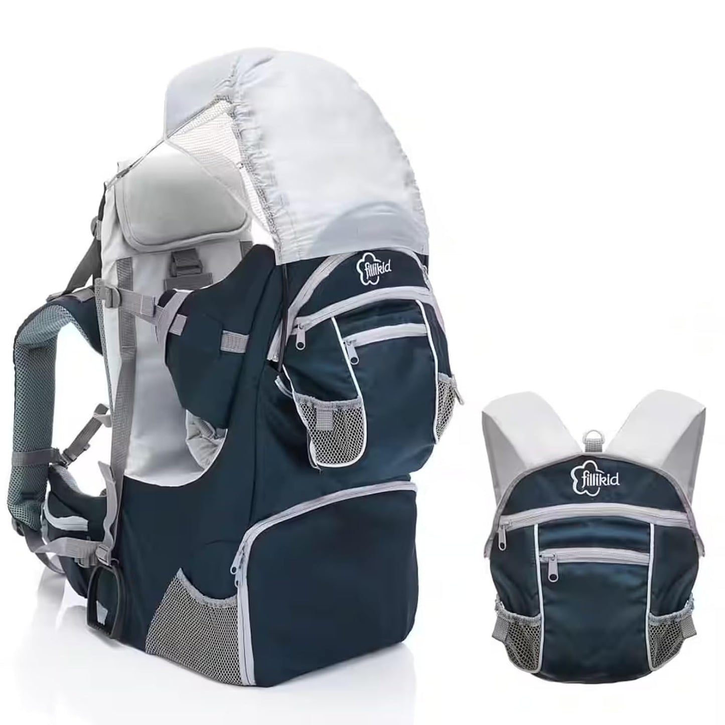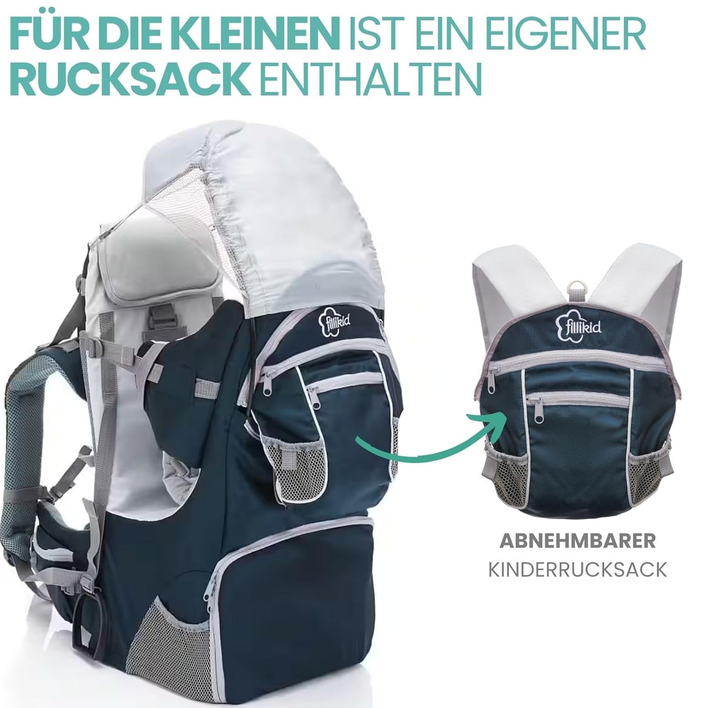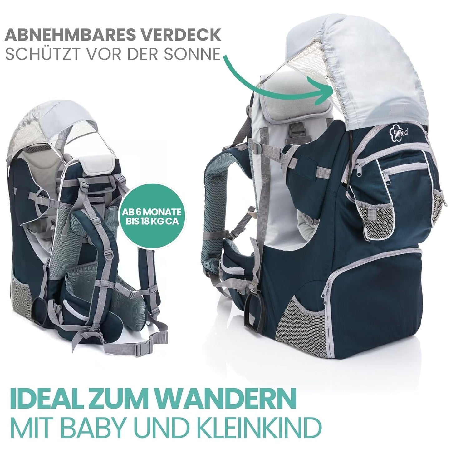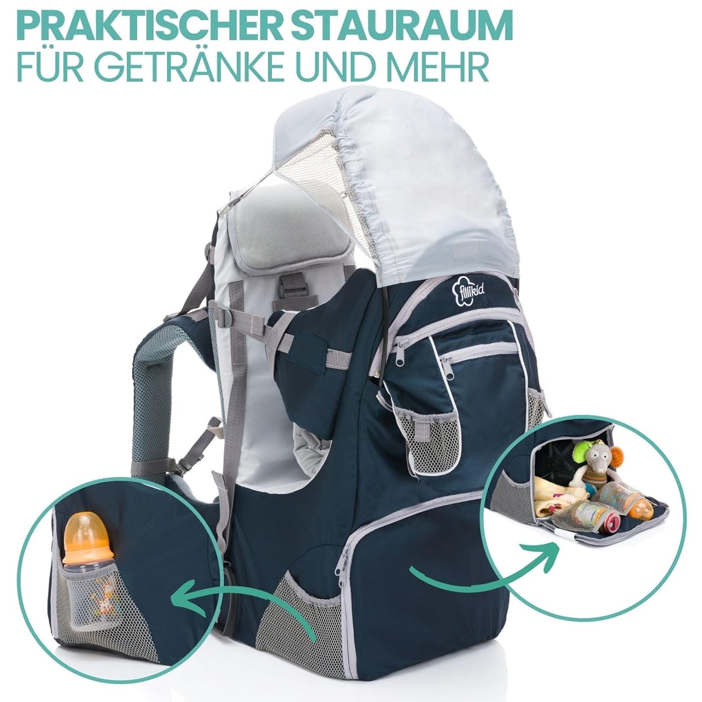 Fillikid Rückentrage - Rücken Babytrage mit Sonnenschutz, Gurt, Kinder Rucksack und Staufächern - Kraxe zum Wandern mit Baby und Kleinkind, bis 18 kg - Blau Grau