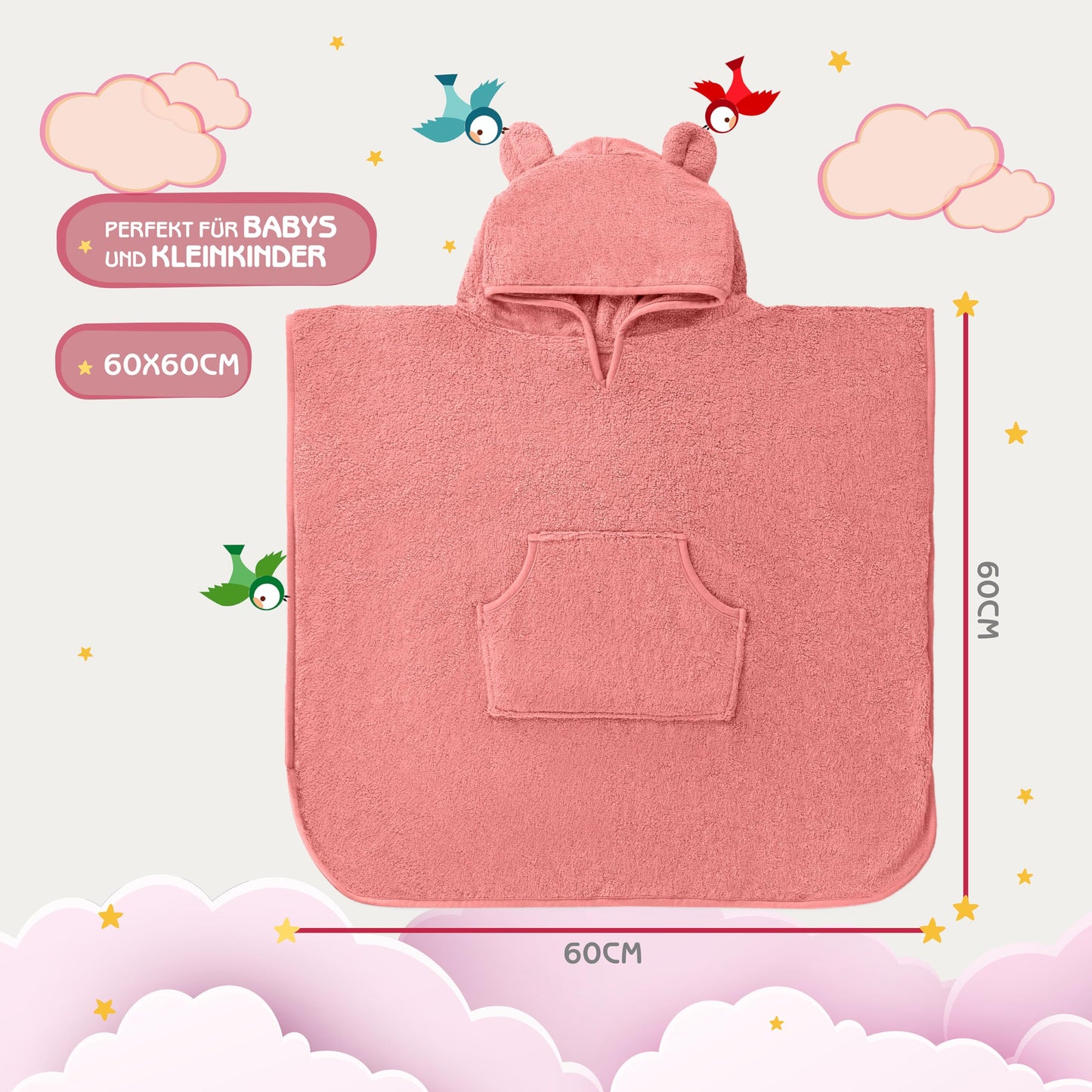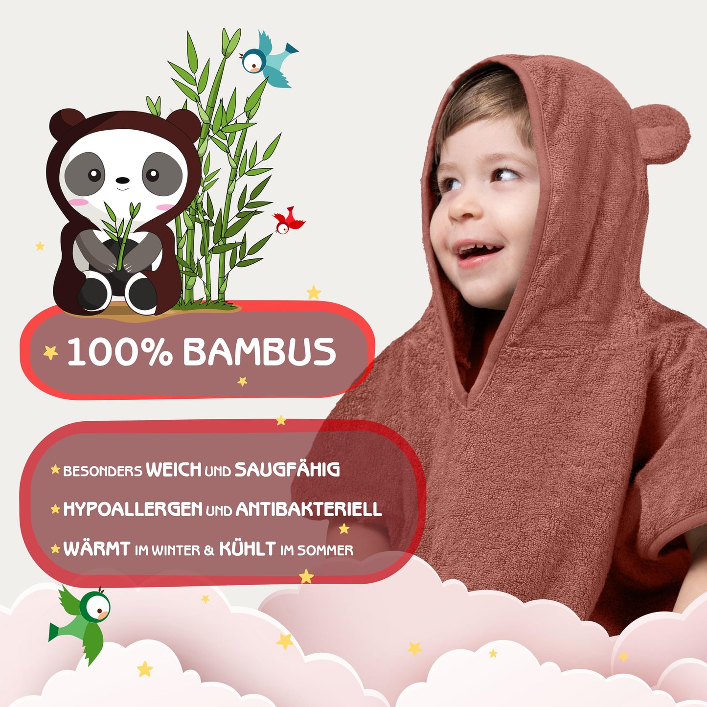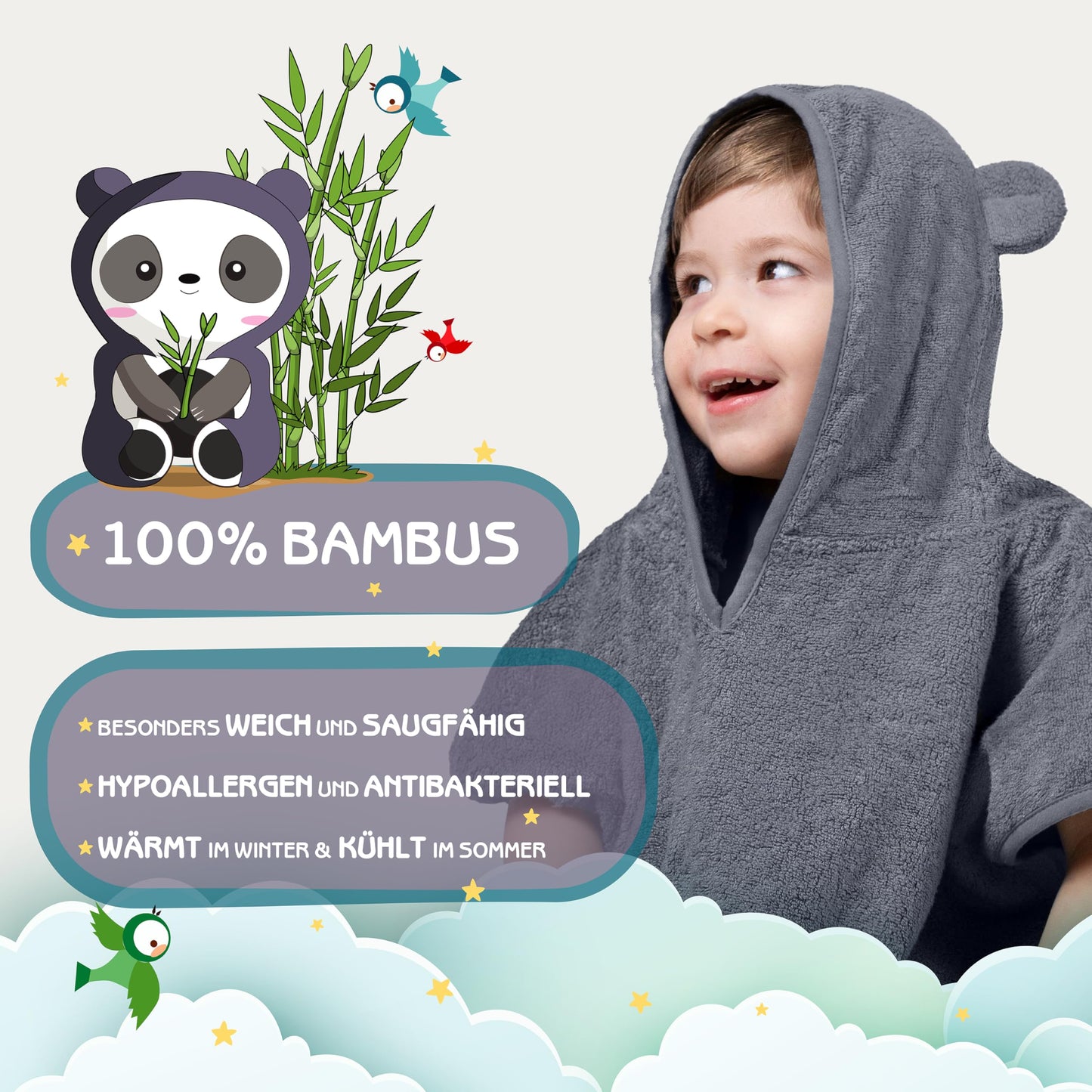 • 🐼 𝐅Ü𝐑 𝐁𝐀𝐁𝐘𝐒 & 𝐊𝐈𝐍𝐃𝐄𝐑: Mit 60x60cm hat unser Kinder Badeponcho die optimale Größe für Babys und Kinder von 0-4 Jahren. Flauschig umhüllt von dem perfekt sitzenden Kinderponcho hält die wolkenweiche Bambuswolle deinen Liebling kuschelig warm und vor Erkältungen geschützt