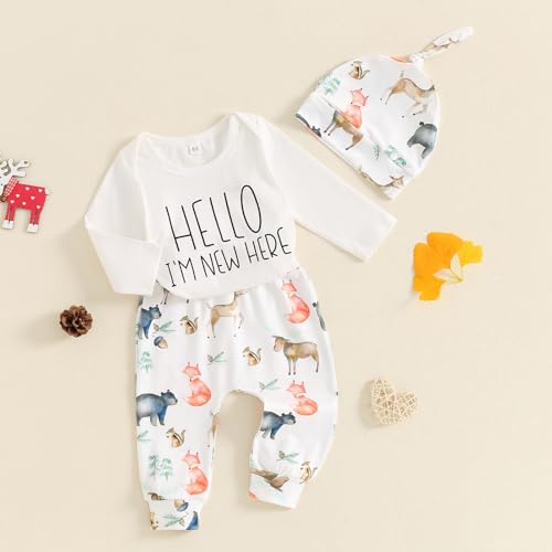Neugeborene Baby Kleidung Set Junge Hello Im New Here Langarm Body und Hose Baumwolle Bekleidungssets für Baby Jungen Babykleidung Set Herbst Winter Outfits mit Mütze