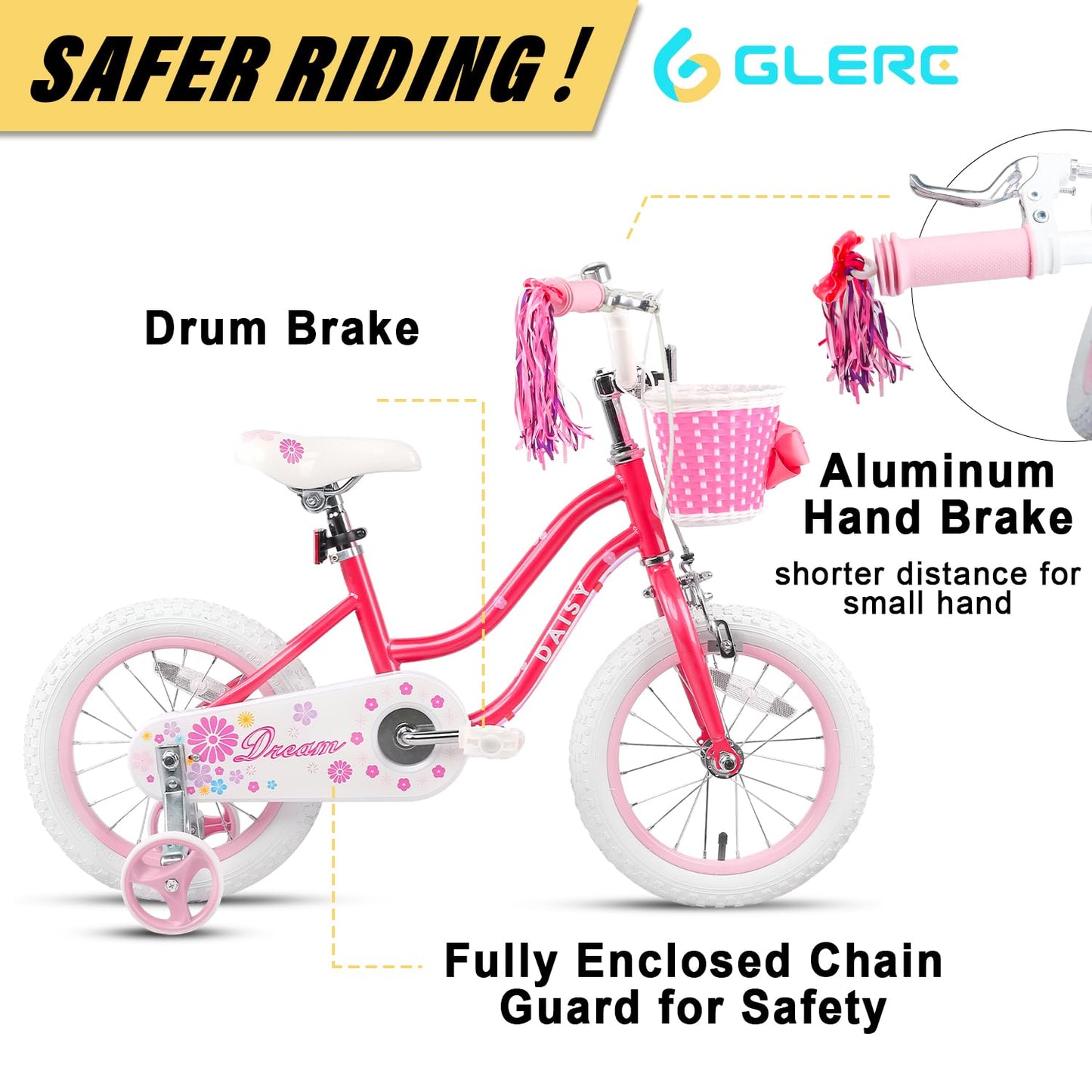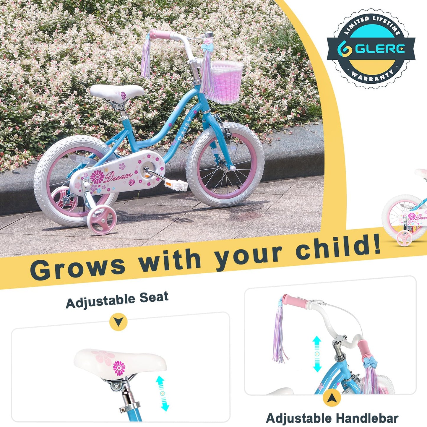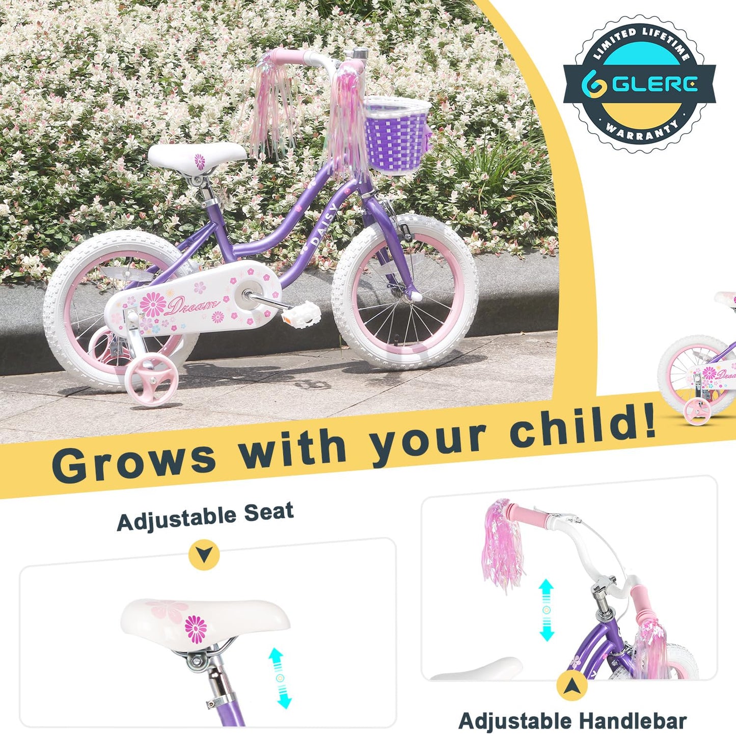 Glerc Kinderfahrrad 12/14/16 Zoll für 2-7 Jahre Mädchen Fahrrad mit Korb, Luftschlangen, Stützräder und Glocke