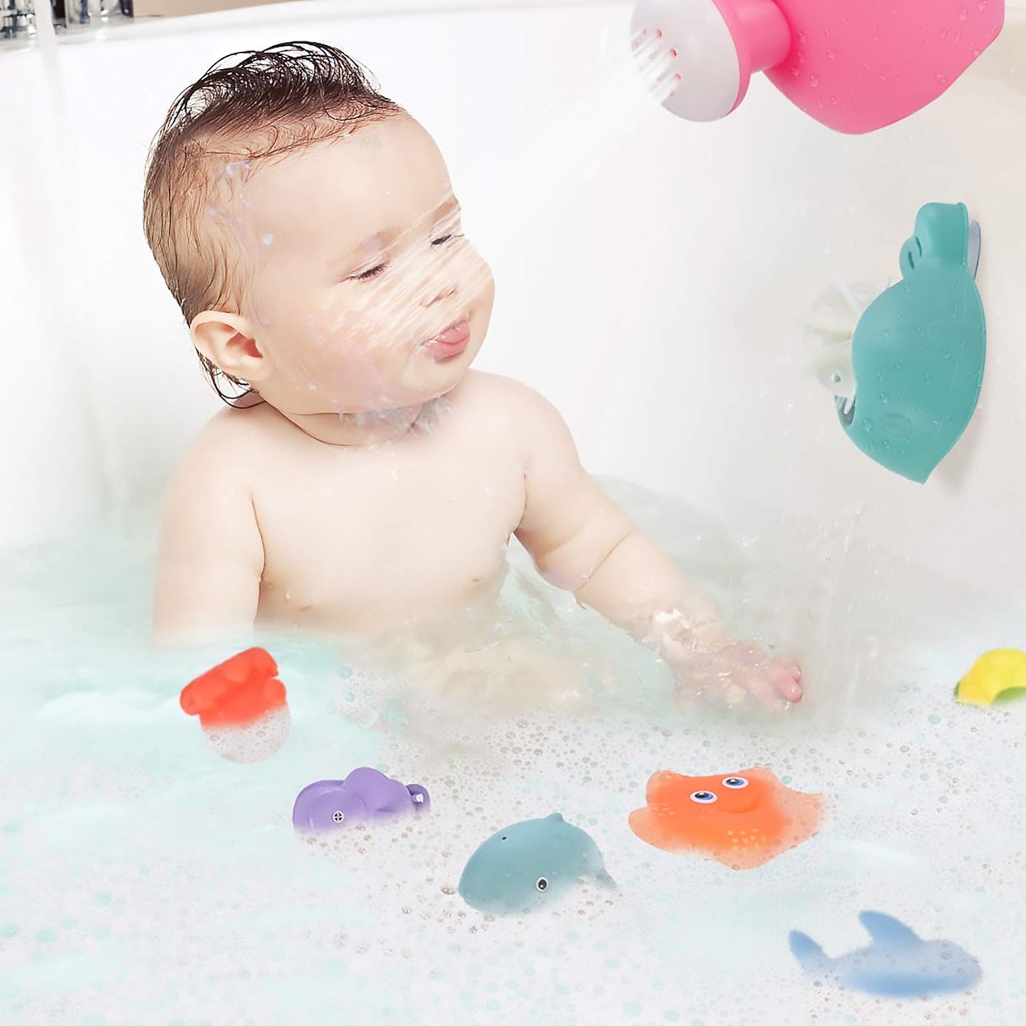 • Complete accessories: bath toy baby has bright colours, lifelike animal pictures, different styles, duck sprinkler x 1 + whale water wheel x 1 + portable water bottle x 1 + water spoon x 1 + squid x 1 + starfish x 1 + sea turtle x 1 + sea lion x 1 + whale x 1 + shark x 1. Complete accessories, children can learn. When playing playing with the same animals en.