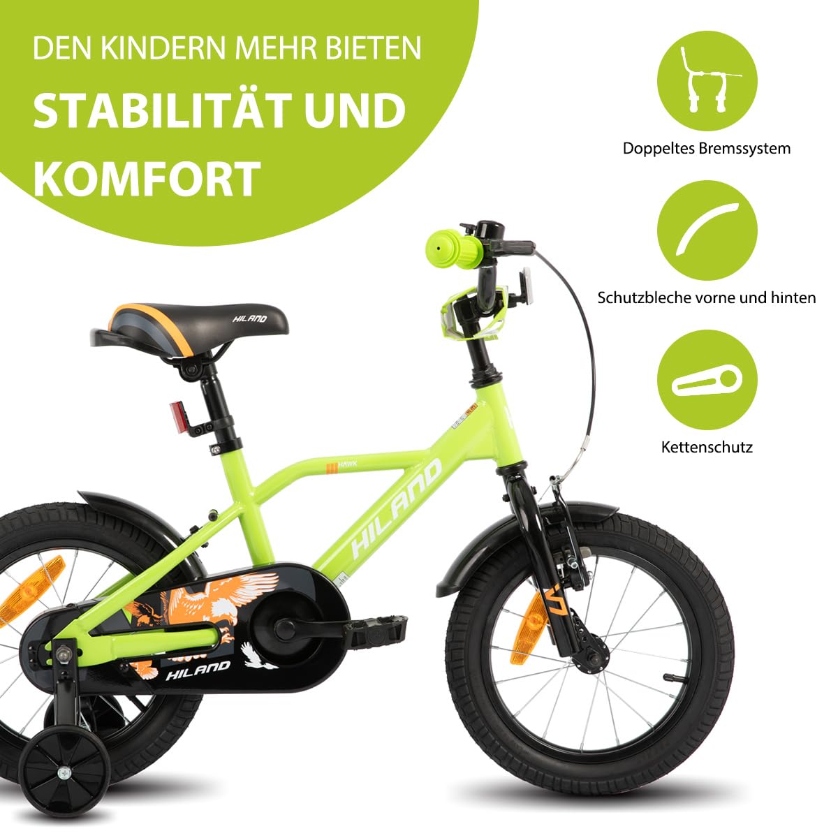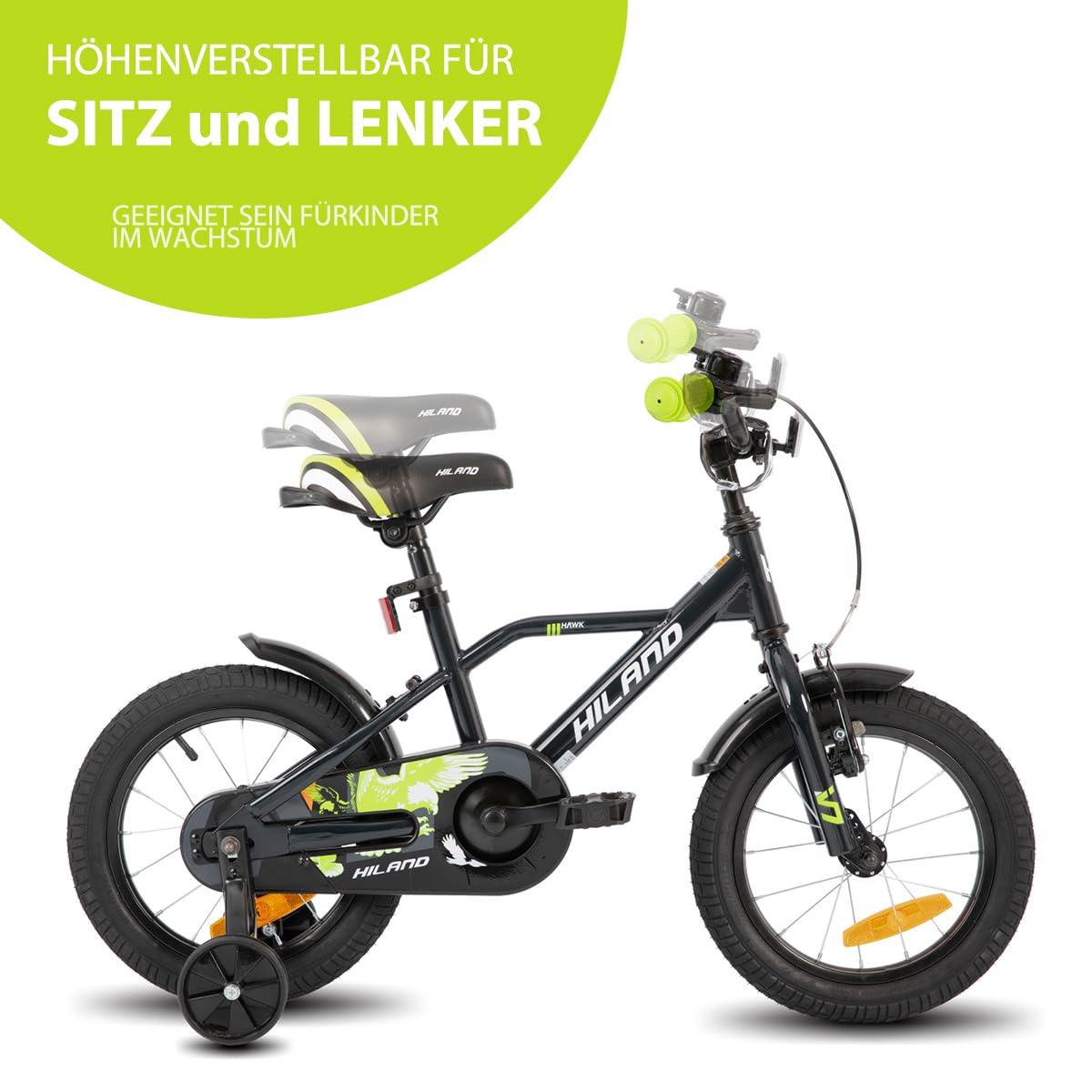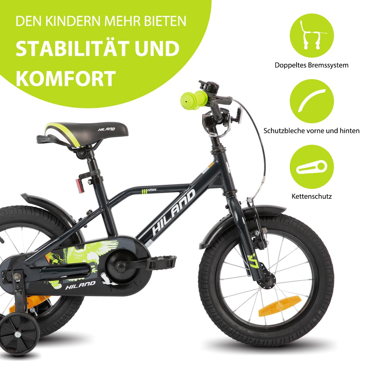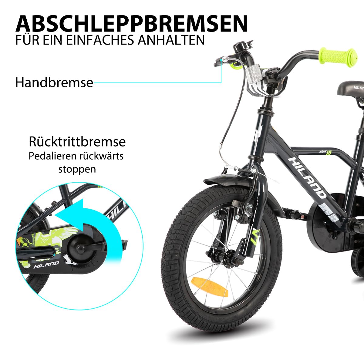 Hiland 12/14/16/20 Zoll Kinderfahrrad, Jungen Fahrrad für 3-10 Jahre, mit Stützrädern, Kinderfahrrad mit Handbremse und Rücktrittbremse, Schwarz/Grün/Blau/Orange