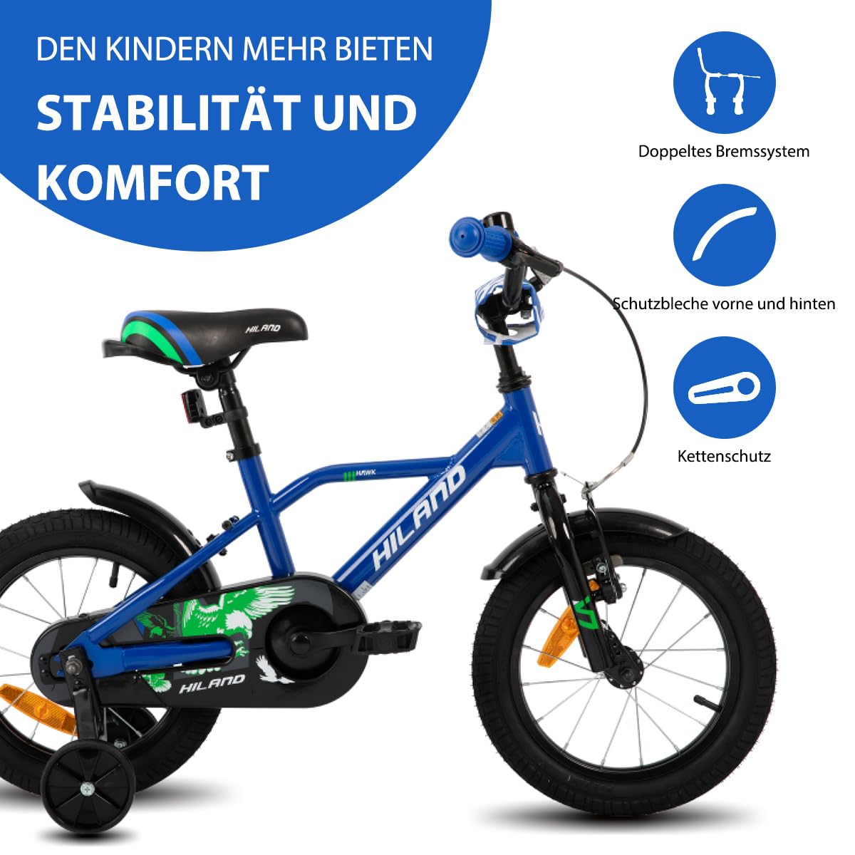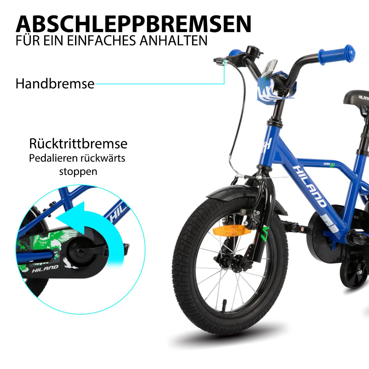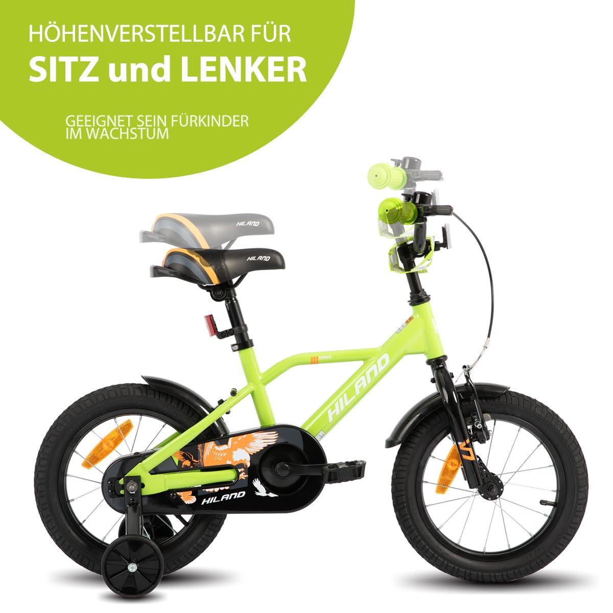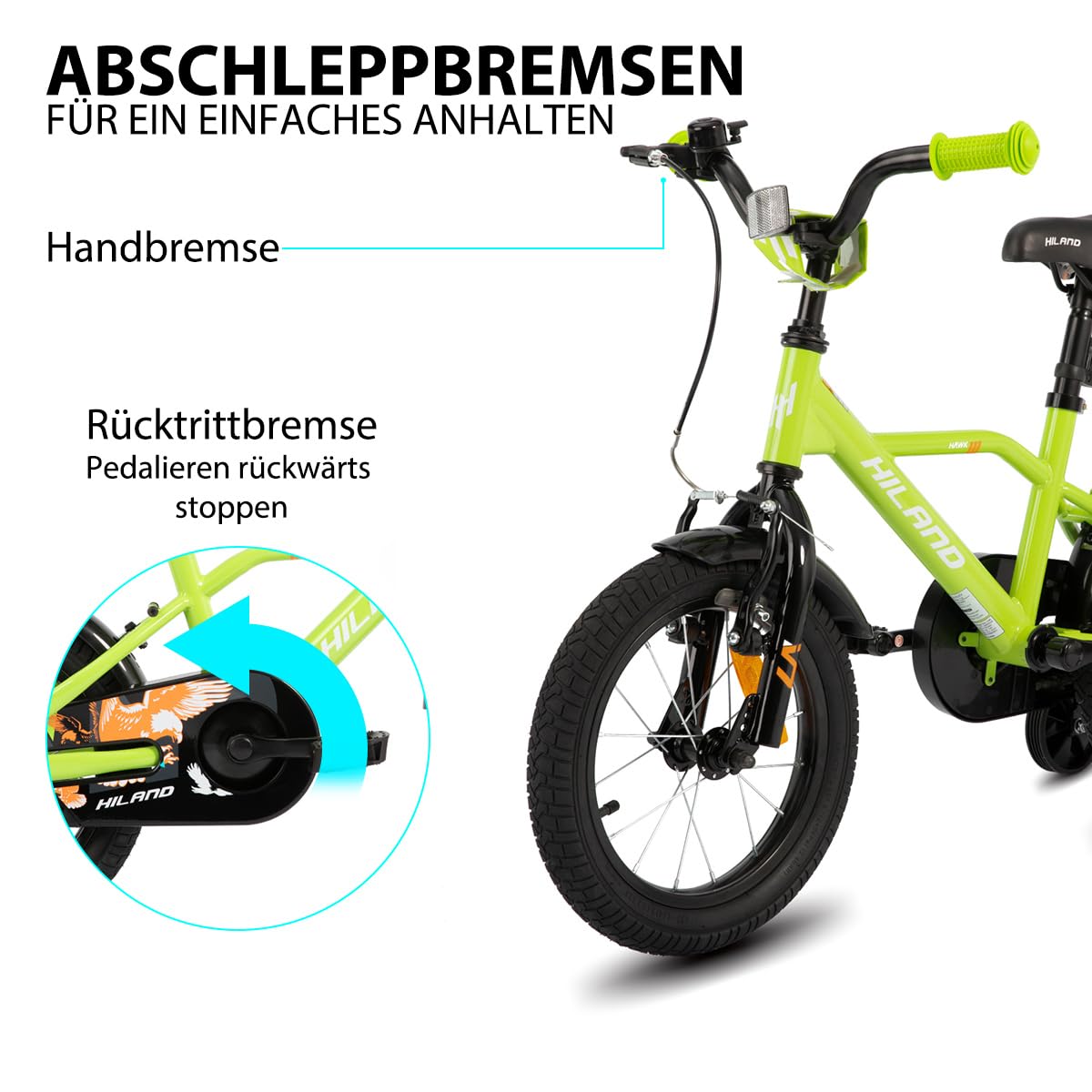 Hiland 12/14/16/20 Zoll Kinderfahrrad, Jungen Fahrrad für 3-10 Jahre, mit Stützrädern, Kinderfahrrad mit Handbremse und Rücktrittbremse, Schwarz/Grün/Blau/Orange