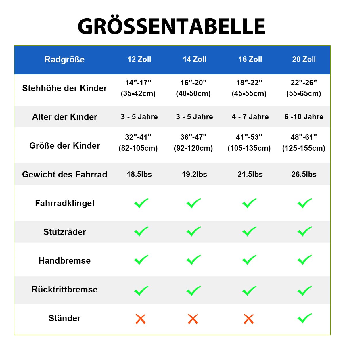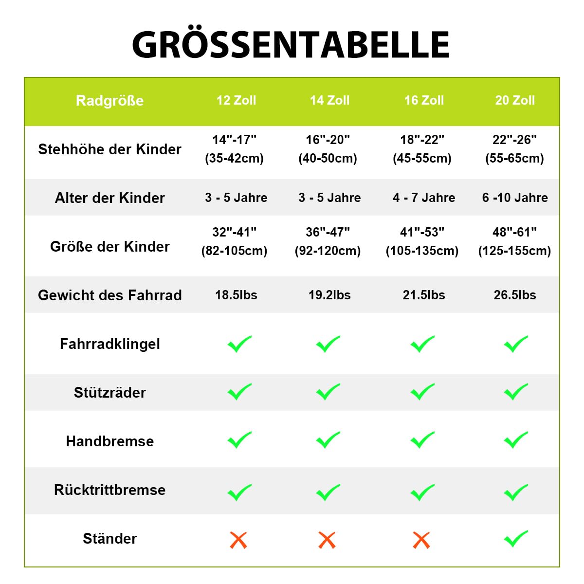 • Erhältlich in 12, 14, 16 und 20 Zoll, passend für unterschiedliche Altersgruppen und Größen.