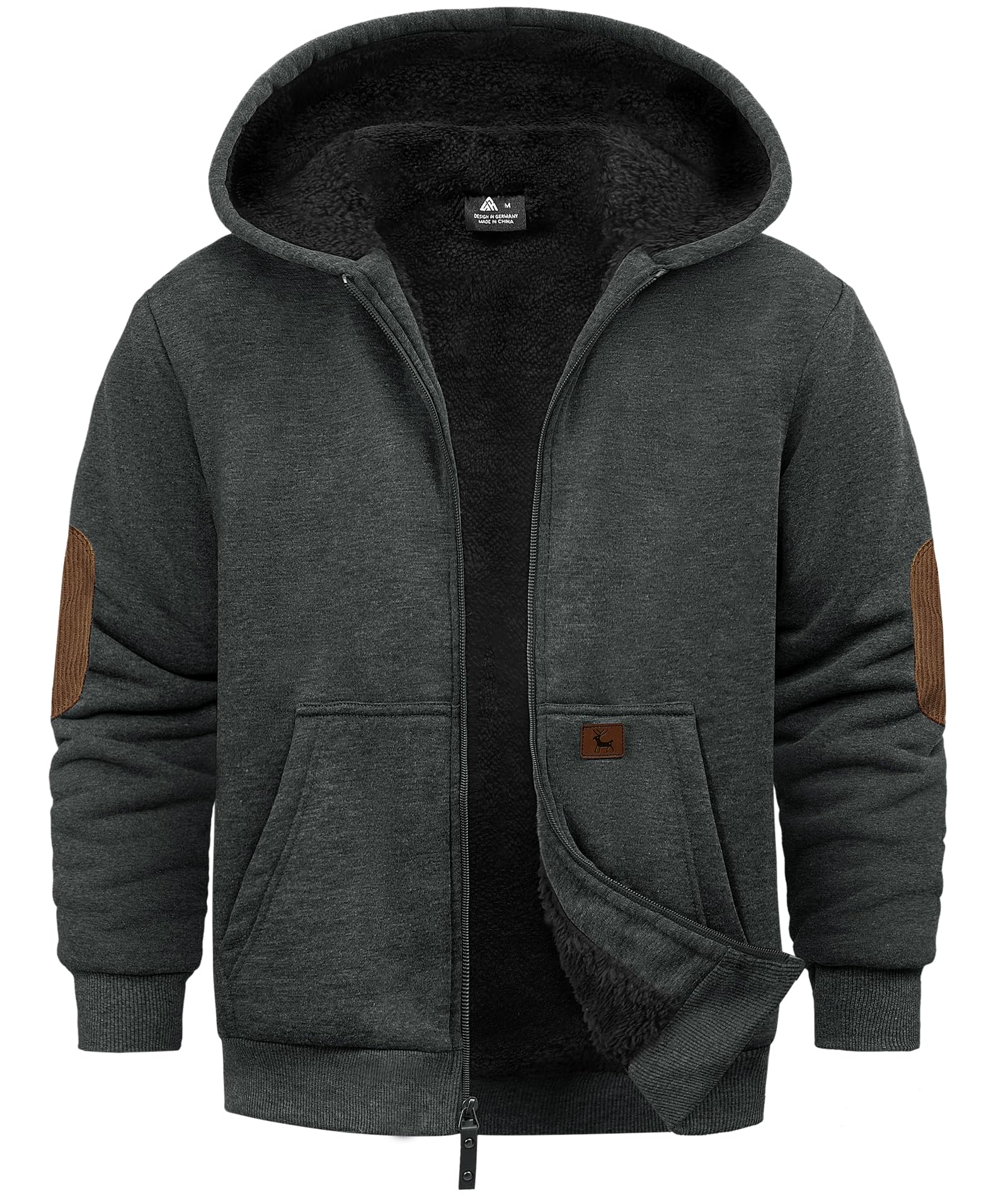 Produktpräsentation mit Kapuzenjacken in verschiedenen Farben, darunter Schwarz, Marineblau und Rot, mit Fleecefutter und Fronten mit Reißverschluss