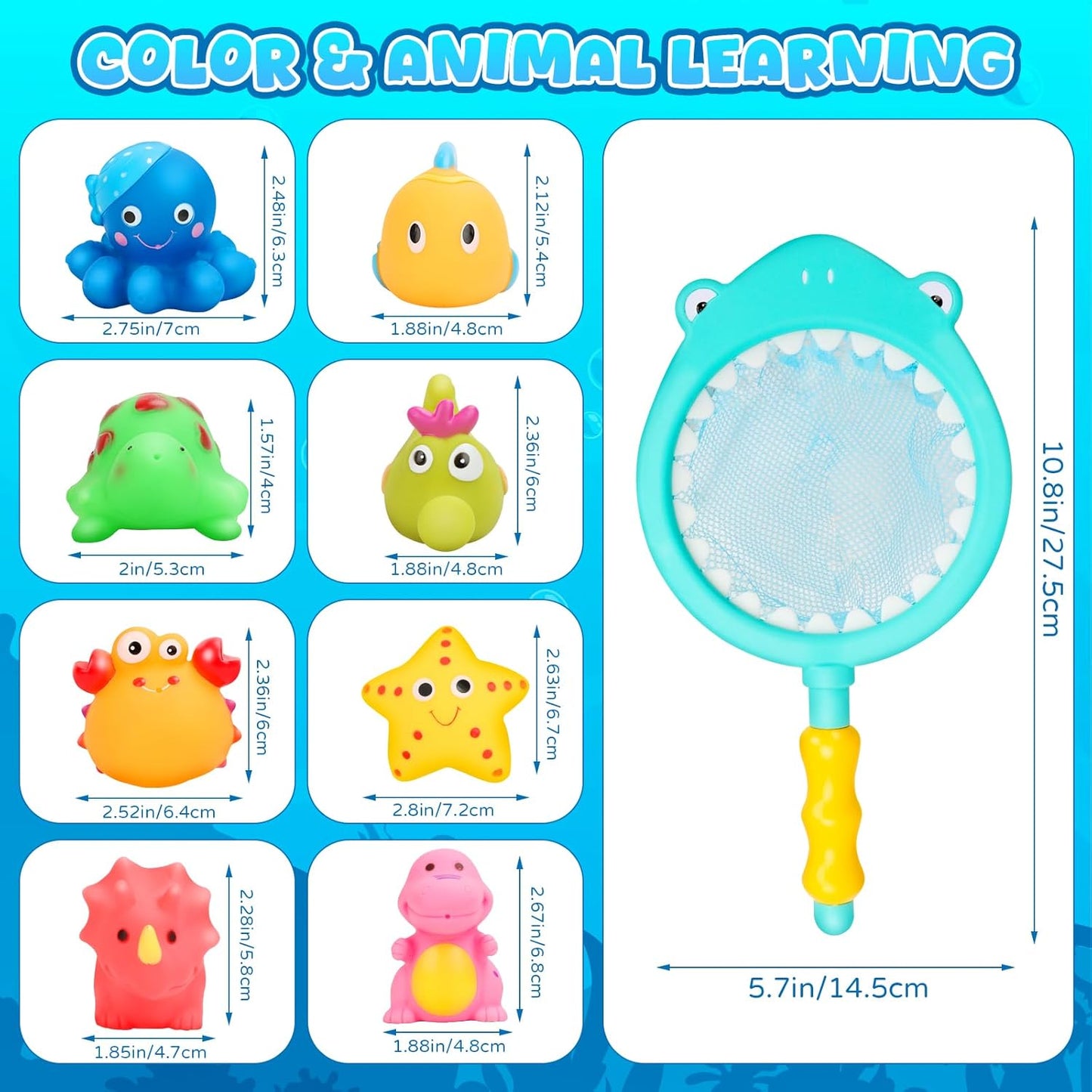 • Wasserspielzeug für Kinder: Dieses Set umfasst 6 Meerestiere, 2 Dinosaurier und ein Hai-Angelnetz. Jedes Tier ist durch sein leuchtend bunte Design sofort die Aufmerksamkeit der Kinder auf sich ziehend und lädt zu fantasievollen Rollenspielen ein. Diese 9 schwimmenden Spielzeuge werden sicherlich zu den unvergesslichen 'Wannenfreunden' Ihres Babys und verwandeln jede Badezeit in einen besonderen Moment.