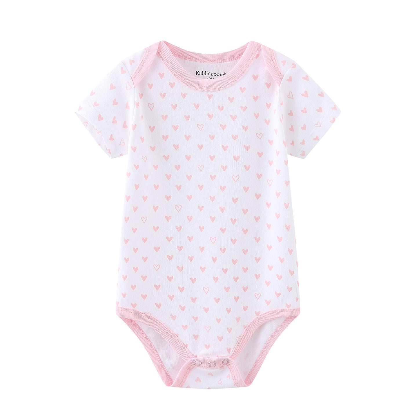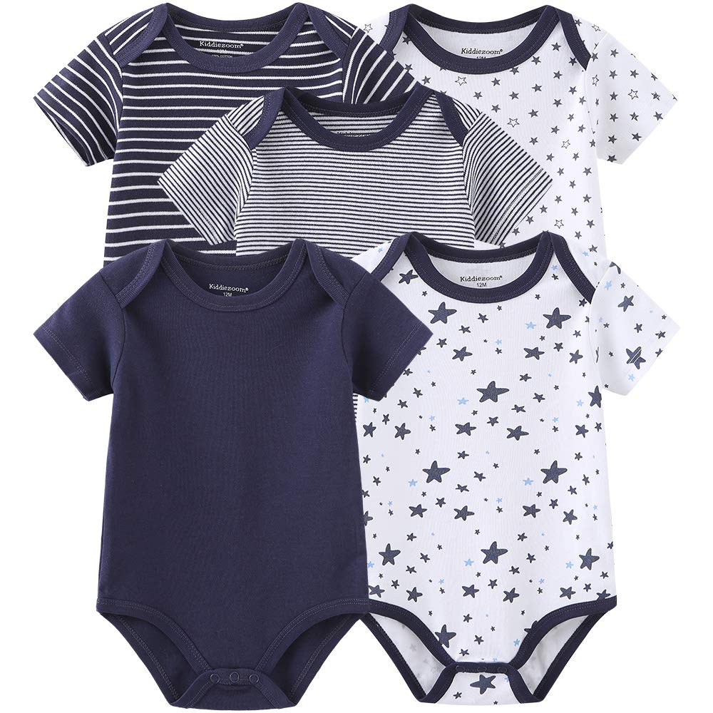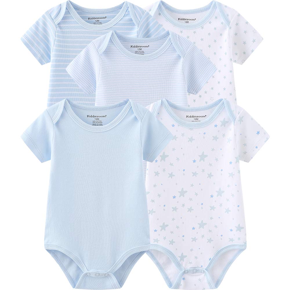 • Fünf Kurzarm-Bodys aus babyweicher Baumwolle mit Streifen, Drucken und Feststoffen