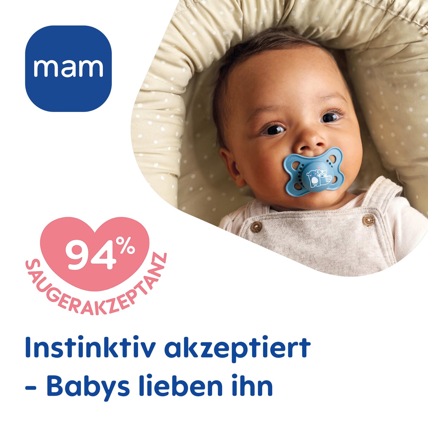 • Instinktiv akzeptiert – Der stillfreundliche Sauger des MAM Original ist aus speziellem, besonders weichem SkinSoft Silikon und fühlt sich unvergleichlich sanft und vertraut in Babys Mund an, fast wie Mamas Brust