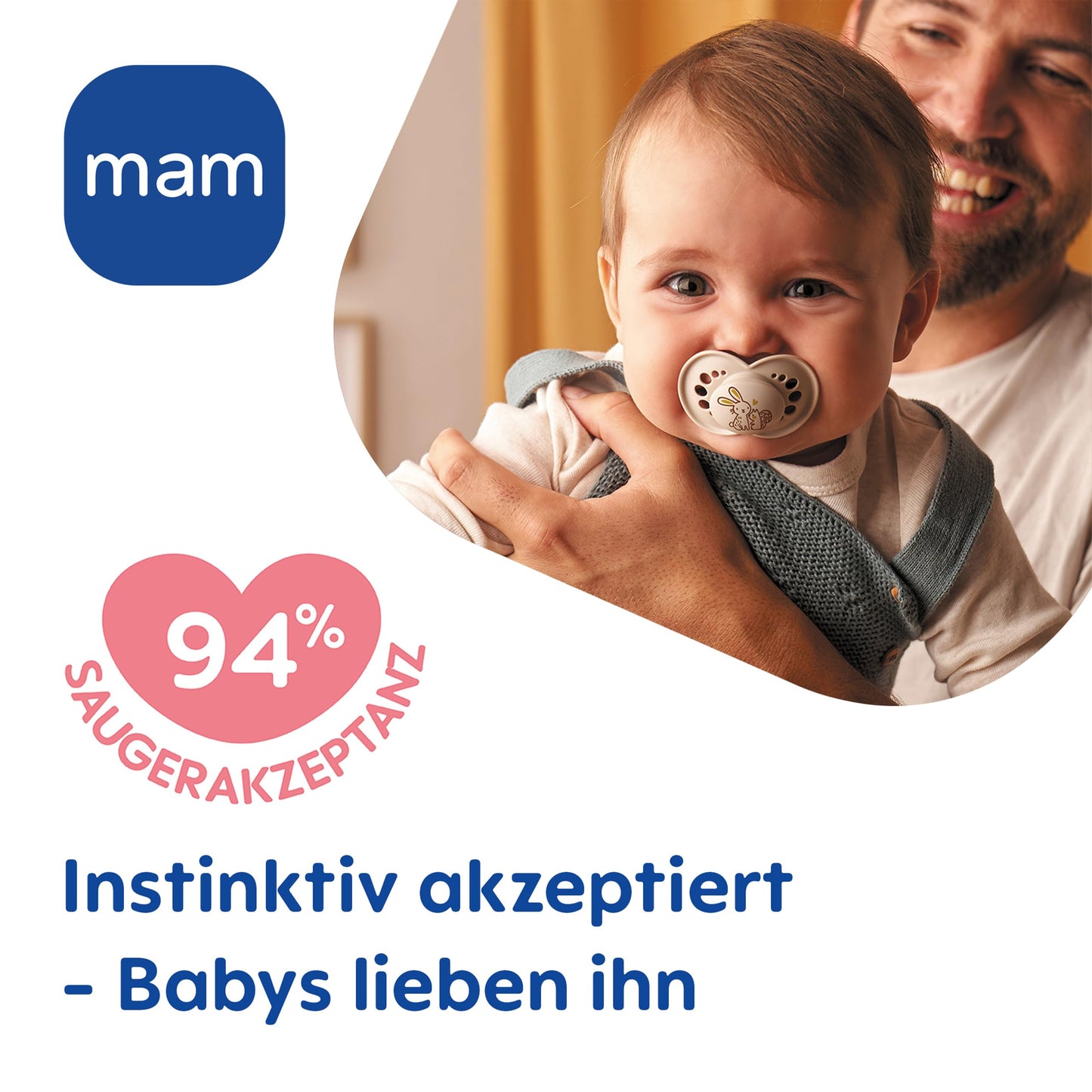 - Instinktiv akzeptiert – Der stillfreundliche Sauger des MAM Original ist aus speziellem, besonders weichem SkinSoft Silikon und fühlt sich unvergleichlich sanft und vertraut in Babys Mund an, fast wie Mamas Brust