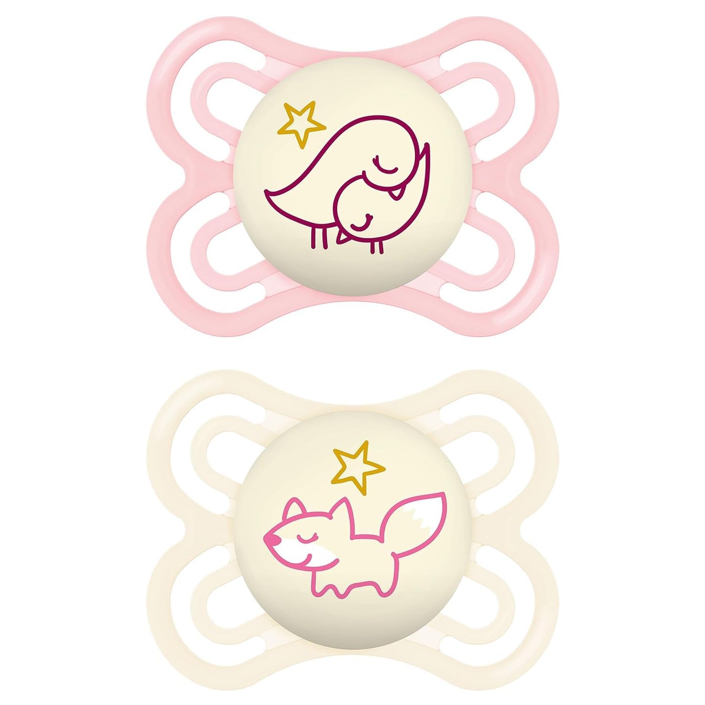 MAM Perfect Day & Night Schnuller | 0-6 Monate | Babyschnuller für Neugeborene | 94% Akzeptanz | beugt Zahnfehlstellungen vor | mit Zahnmedizinern entwickelt| SkinSoft Silikon | Vogel/Fuchs | 4 Stück