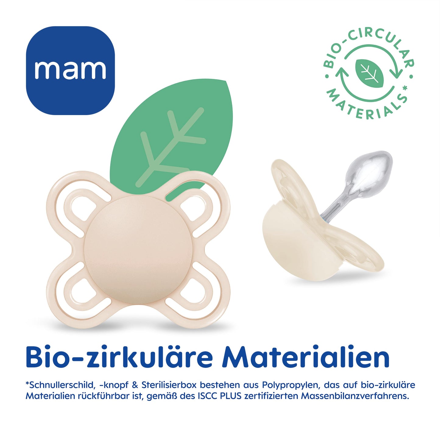 Wir übernehmen Verantwortung für dein Baby und unseren Planeten. Schnullerschild, -knopf & Sterilisierbox sind aus Polypropylen, das gemäß dem von ISCC PLUS zertifizierten Massenbilanzverfahren rückführbar auf bio-zirkuläre Rohstoffe ist.