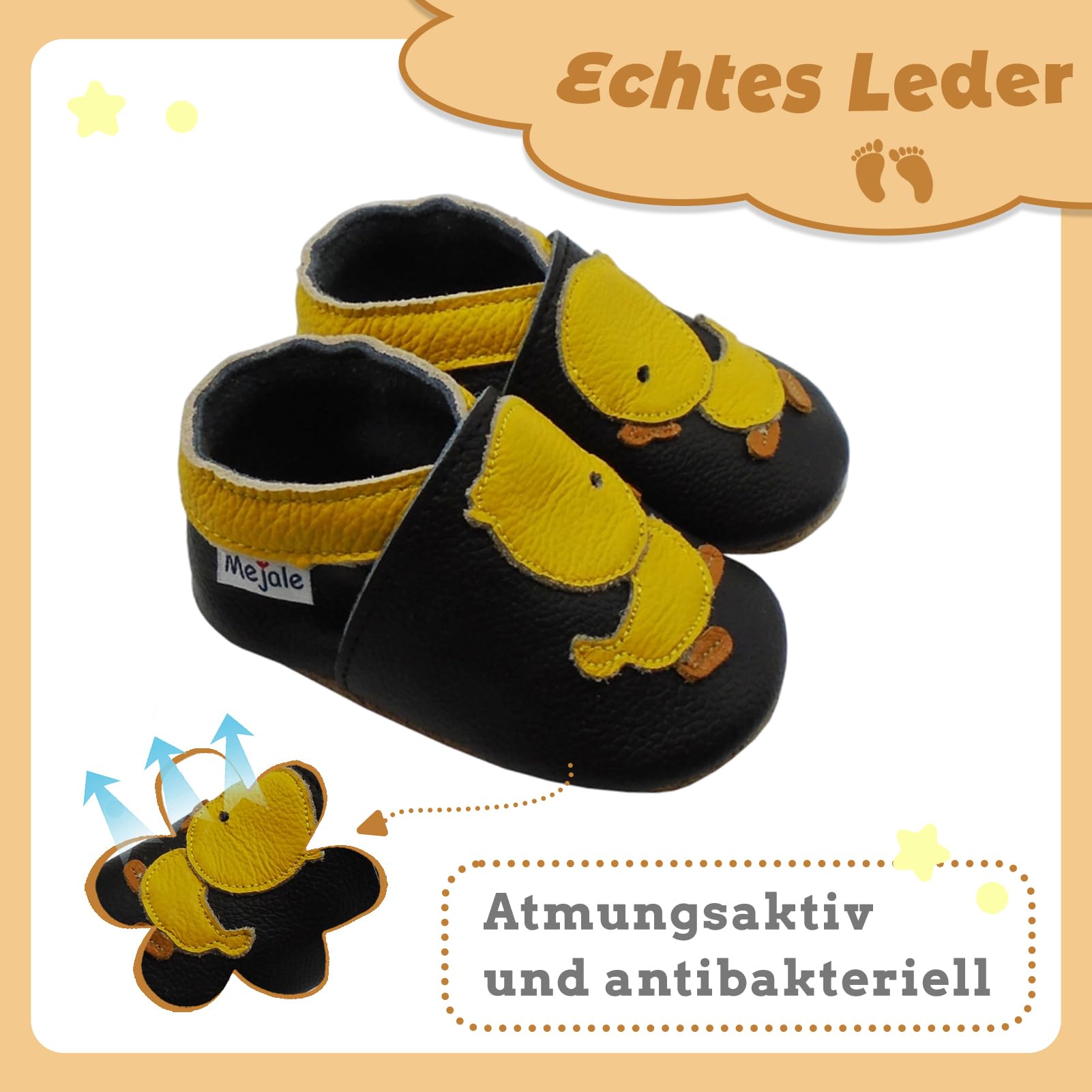 Soft sole baby shoes from Mejale, 100% genuine leather, non-slip wide sole is brushed for comfort and protection. All our shoes have an elastic ankle, so they are easily put on and stay on small feet, although the shoes run larger than the feet, the elastic band still helps the shoes stay on good the soft Leather protects soft baby bones and makes the feet grow more natural.