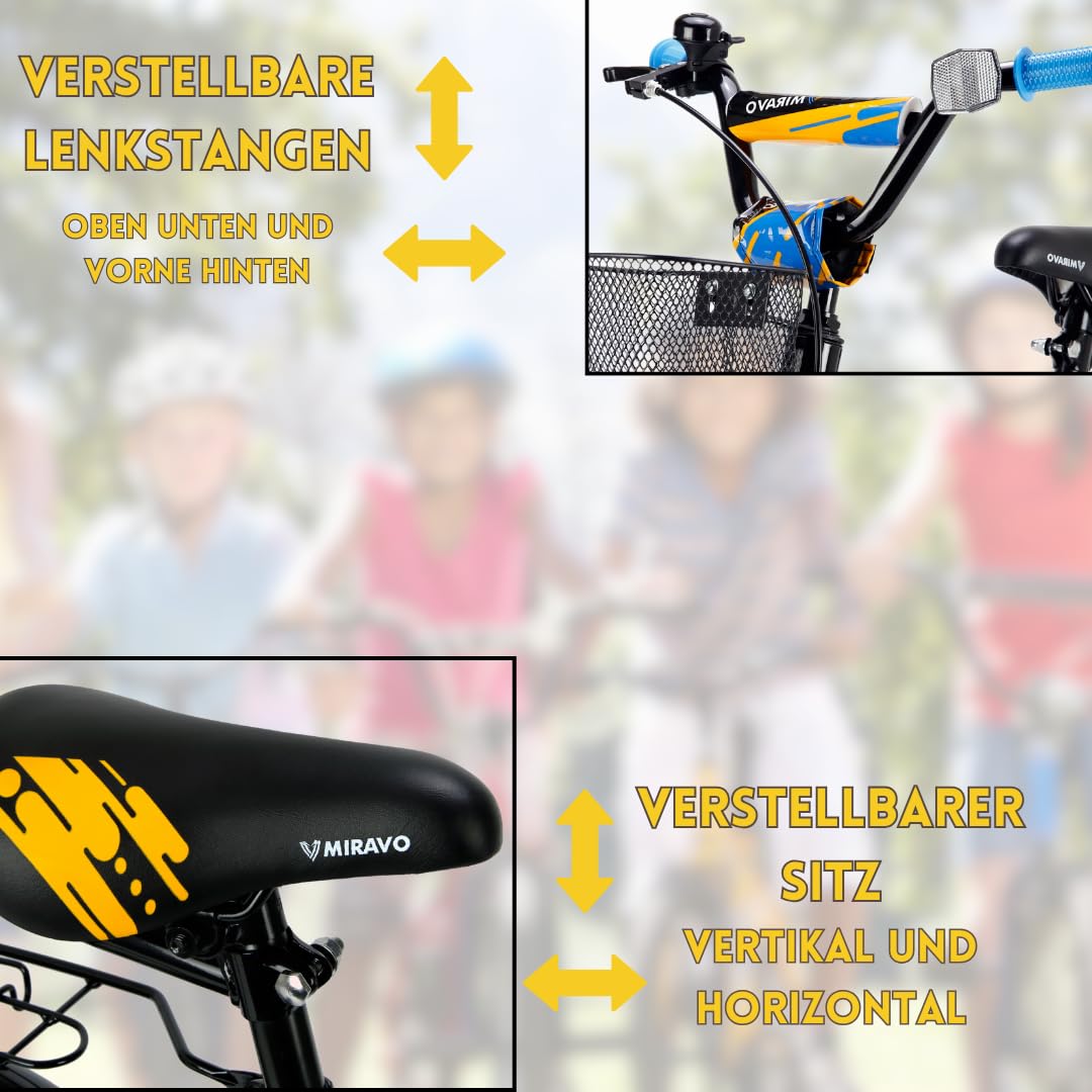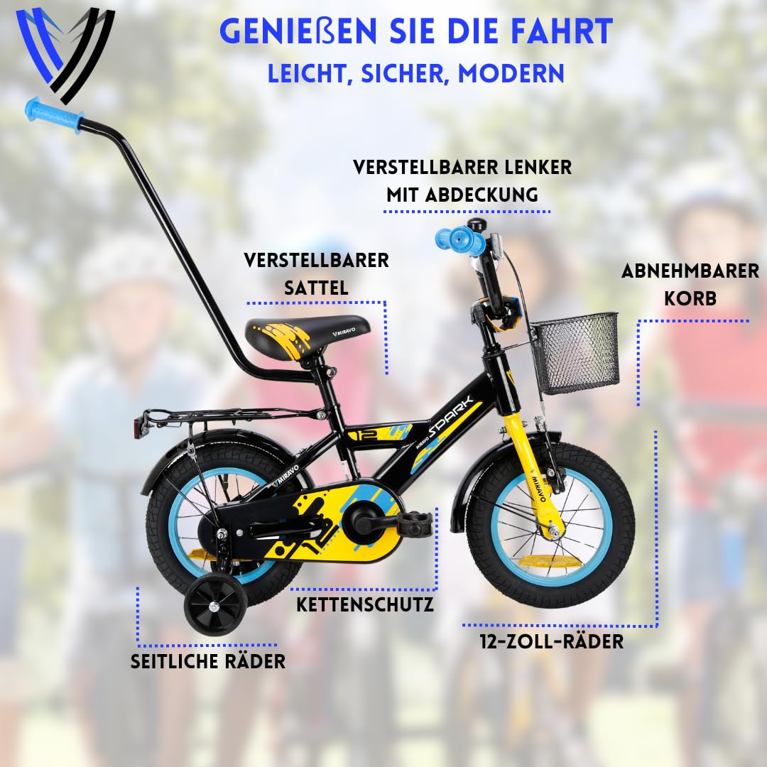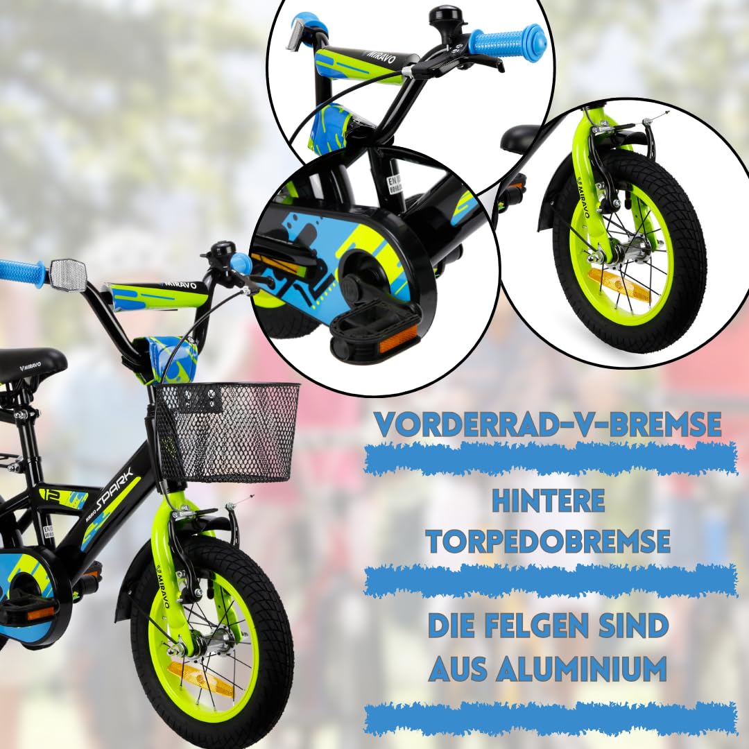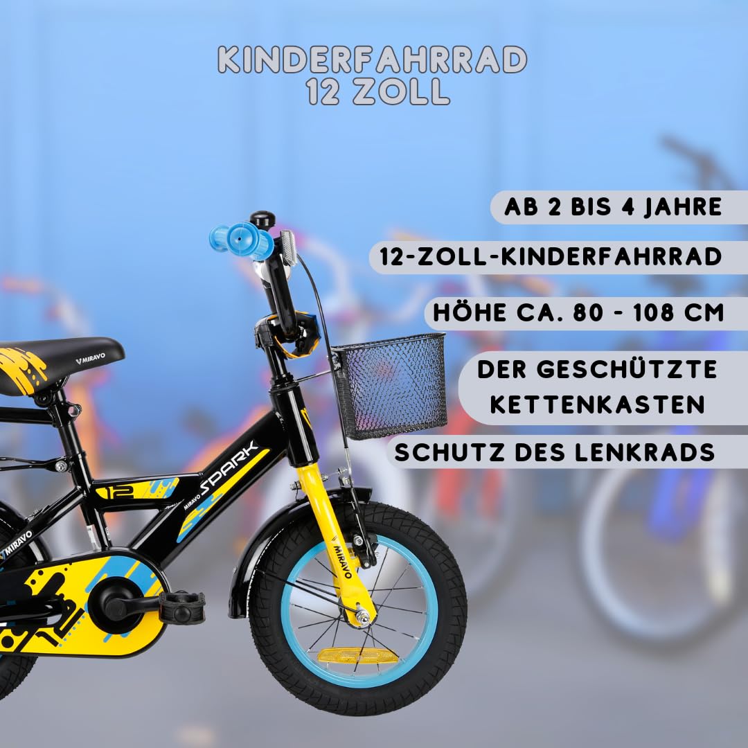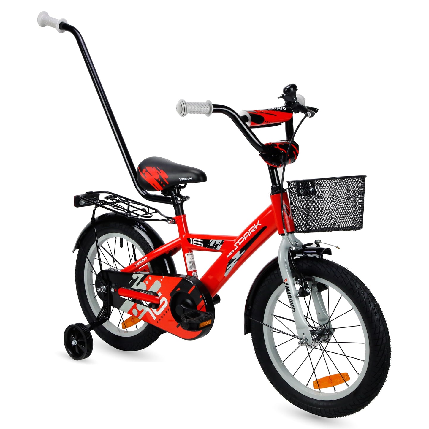 MIRAVO Kinderfahrrad Fahrrad Kinder Ab 2 Bis 8 Jahre Mit Stützrädern Schubstange V-Brake Bremsen Rückstrahl Aufkleber 12 16 20 Zoll Radgröße Korb Für Junge Spark