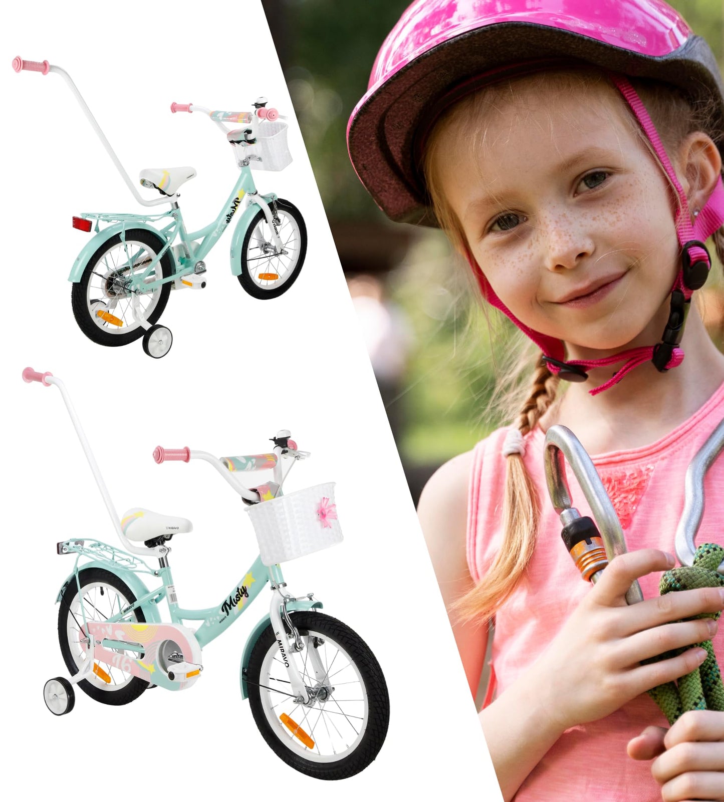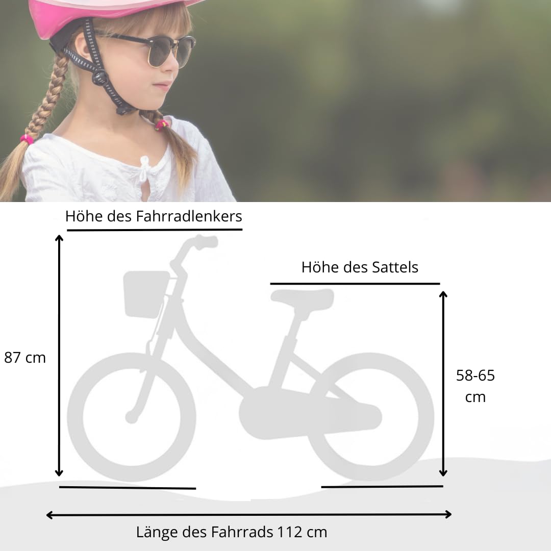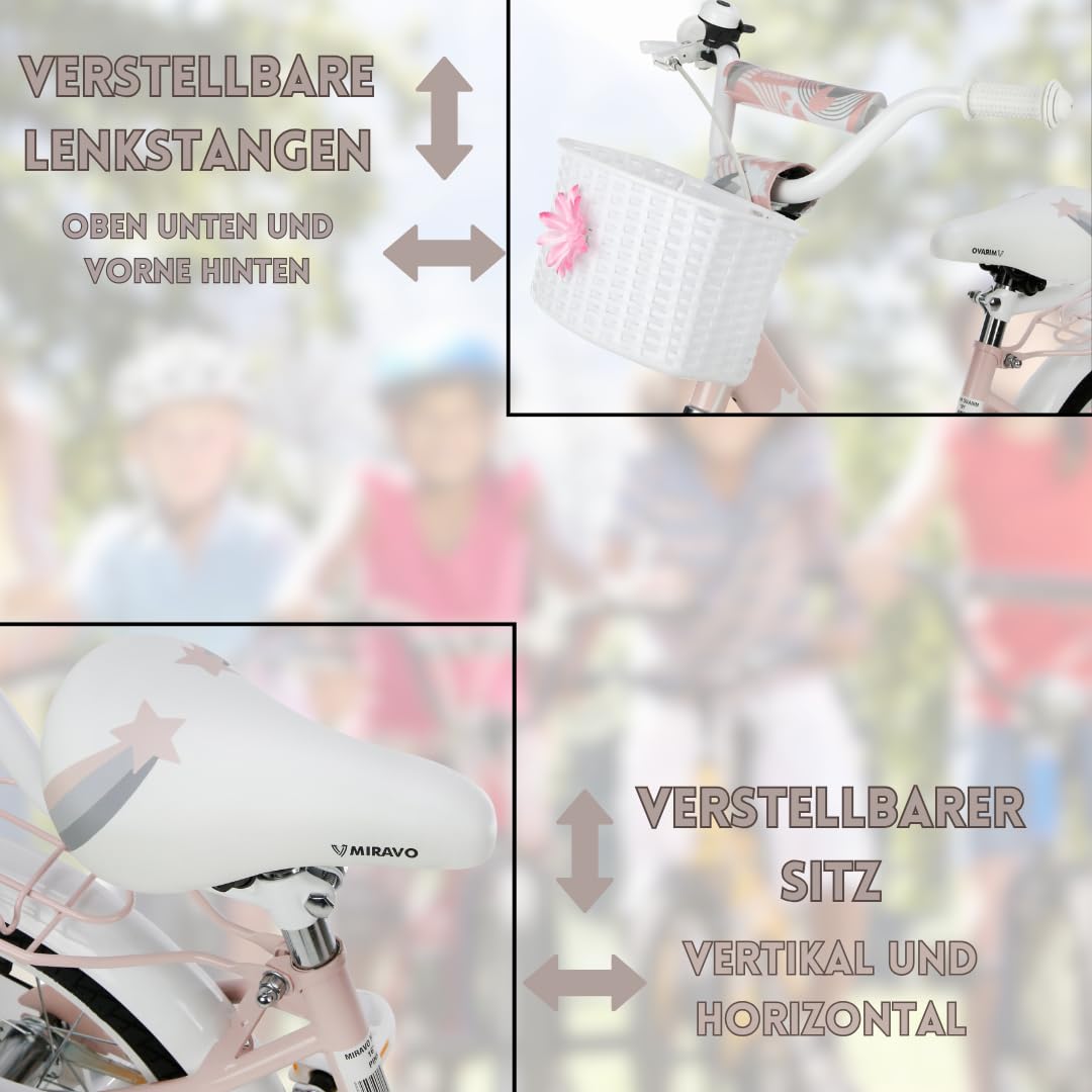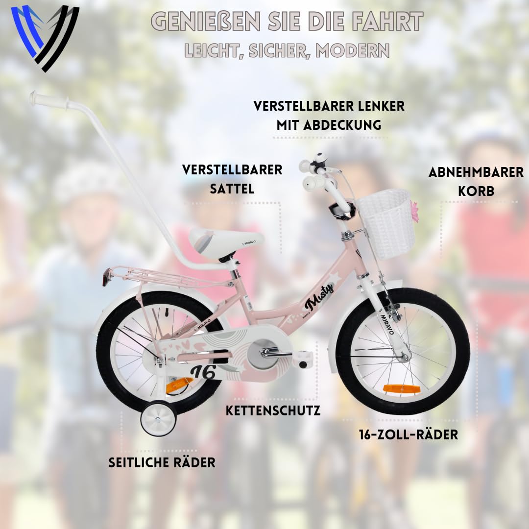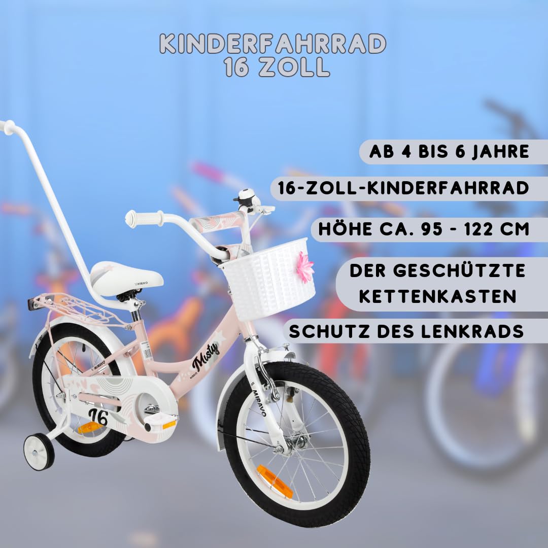 MIRAVO Kinderfahrrad Fahrrad Kinder Ab 2 Bis 8 Jahre Mit Stützrädern Schubstange V-Brake Bremsen Rückstrahl Aufkleber 12 16 20 Zoll Radgröße Korb Für Mädchen Misty