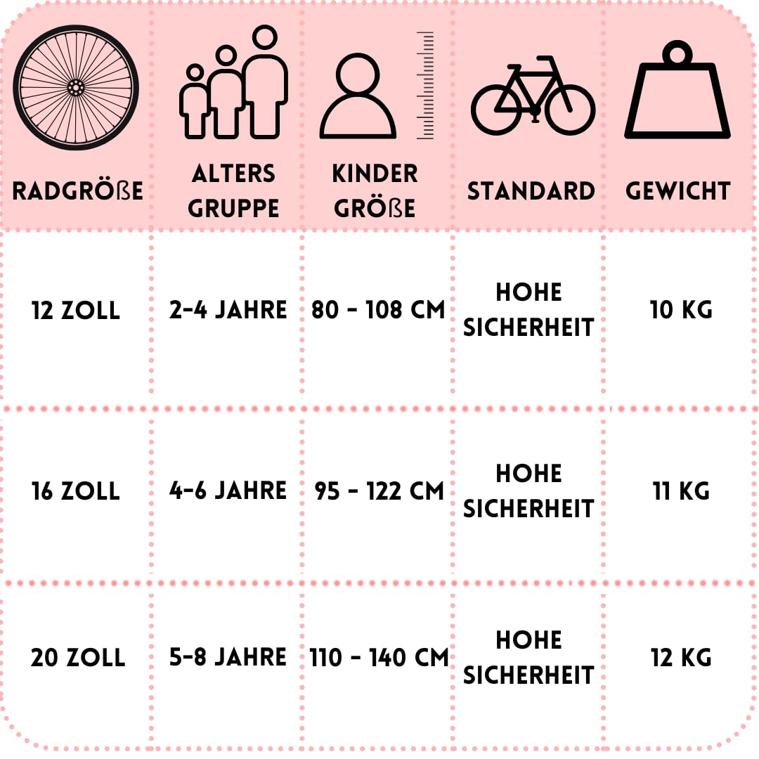 Dieses Kinderfahrrad kommt in verschiedenen Radgrößen von 12, 16 bis 20 Zoll und eignet sich hervorragend für verschiedene Altersgruppen und Größen. Das Fahrrad ist aus hochwertigen Materialien gefertigt und umfasst: