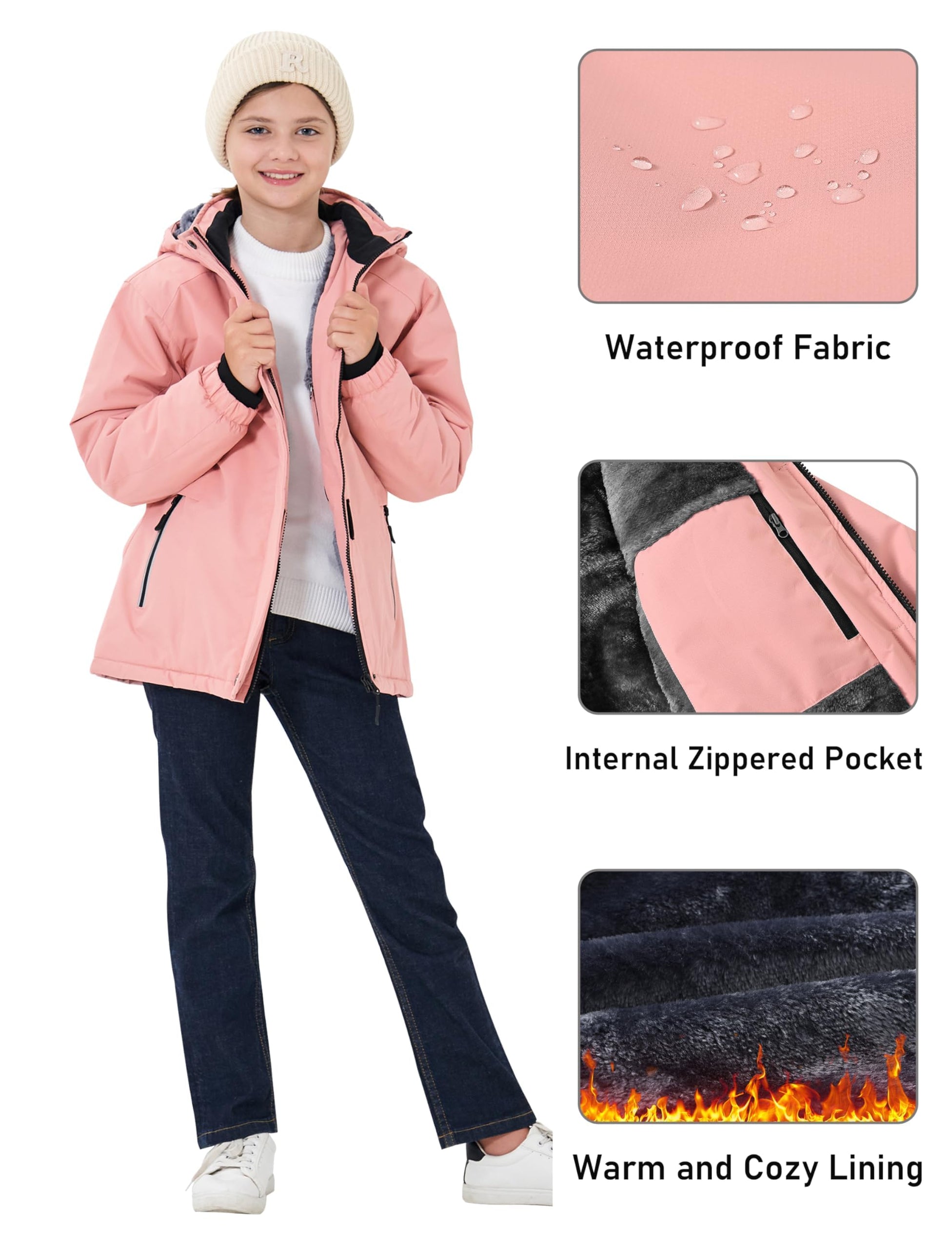 • Girls' ski jacket is windproof and waterproof, hood and an inner layer with soft fleece lining keep children warm and comfortable on cold winter days.
