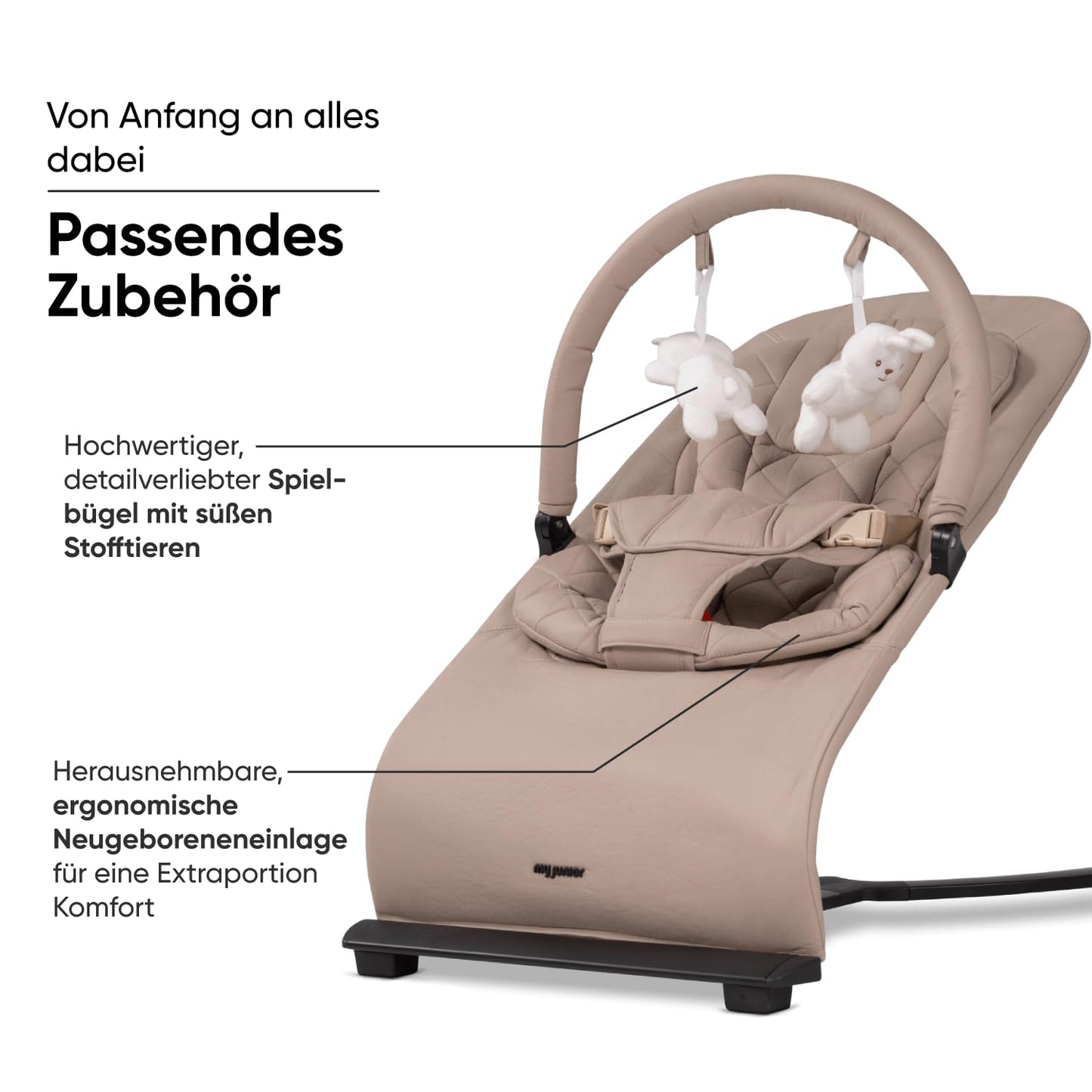 my junior® Motion Bouncer, Ergonomische Babywippe mit Spielbügel, neue Hands-Free-Comfort Technik, 3 Fach-Verstellbar, klappbar, 100% Baumwolle - Kangaroo Beige