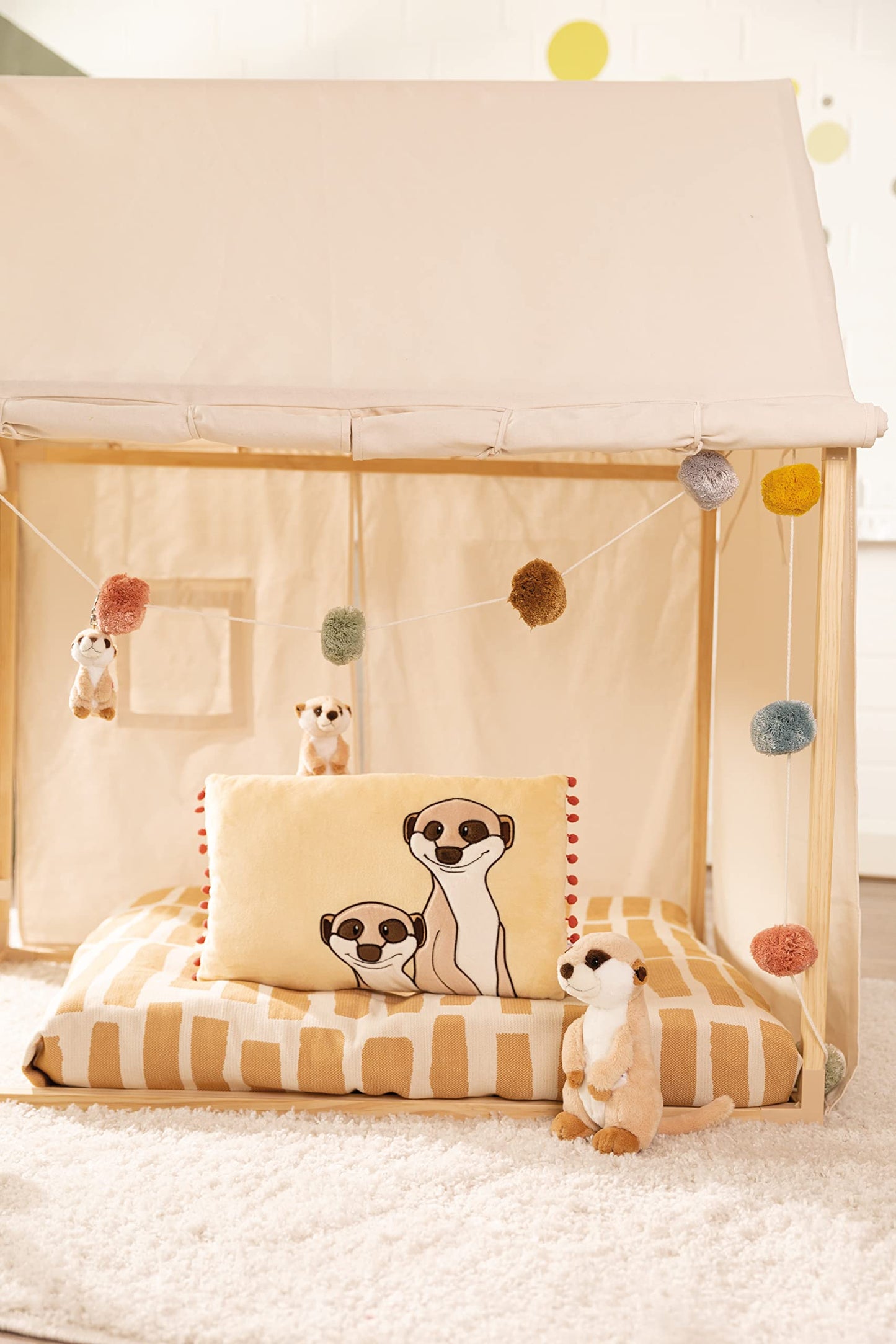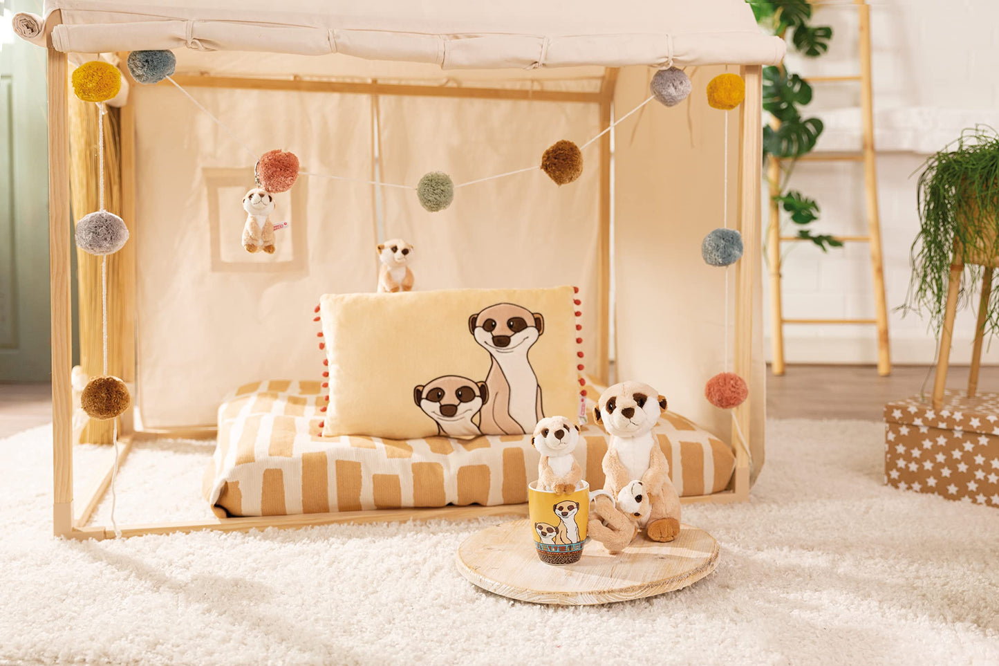 Zusätzlich ist das Kuscheltier auch eine tolle Dekoration im Kinderzimmer. Egal, ob es auf dem Regal steht oder gemeinsam mit den Kleinen im Bett liegt, die süße Erdmännchen-Figur zieht die Aufmerksamkeit auf sich und sorgt für ein fröhliches Ambiente.