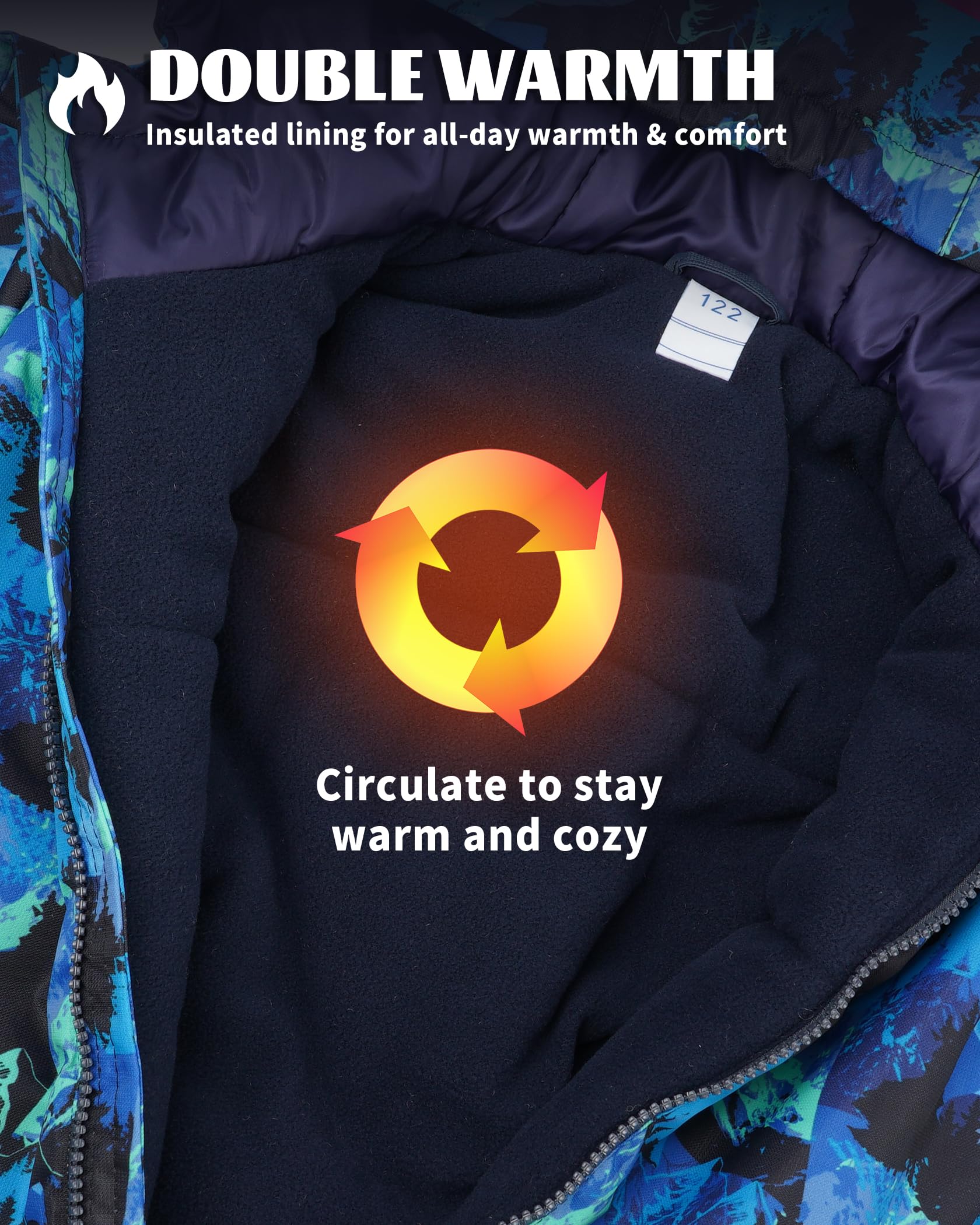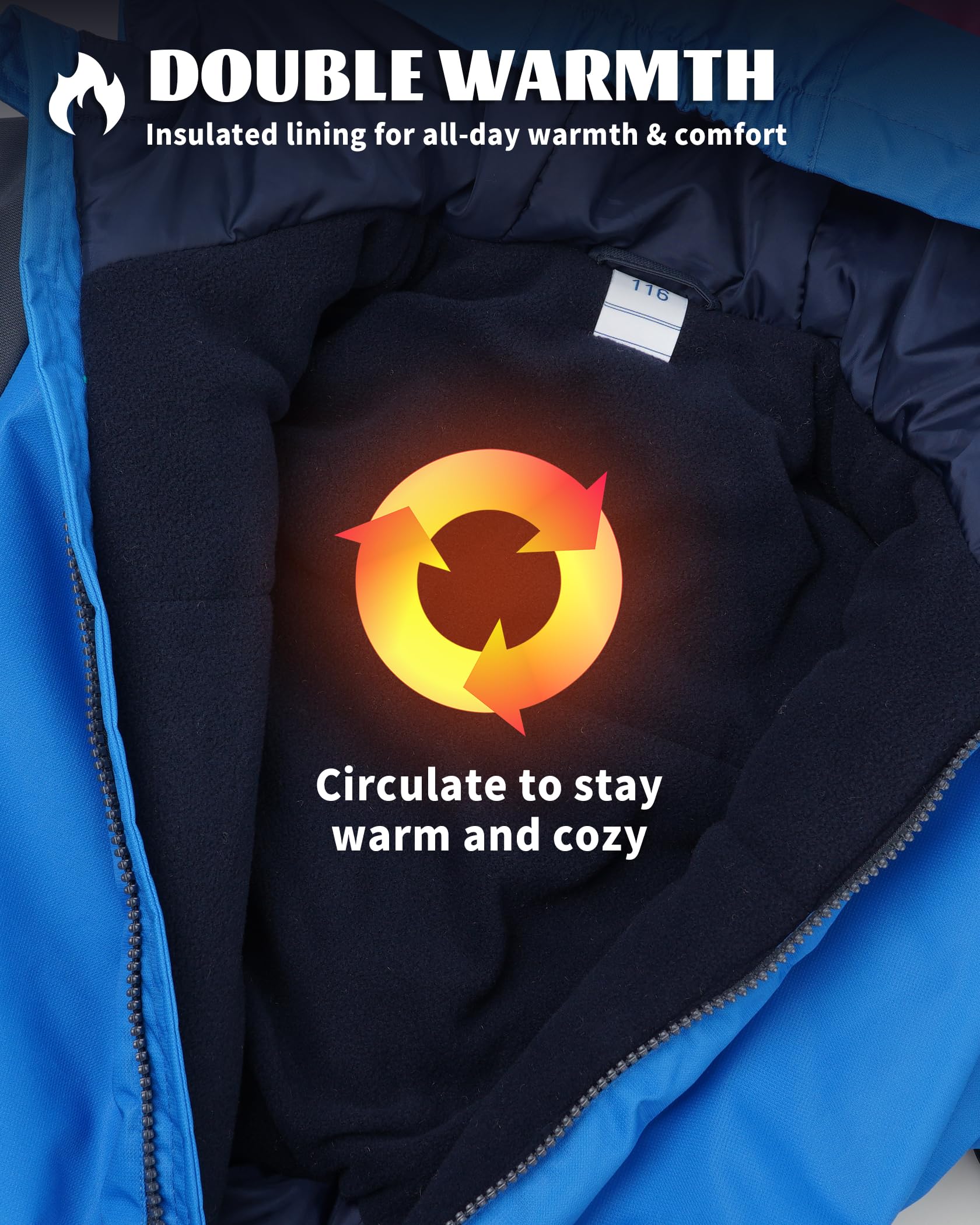Blue and navy children's snowsuit with full-body warmth retention technology, featuring a layered insulation system as shown in the cross-section diagram.