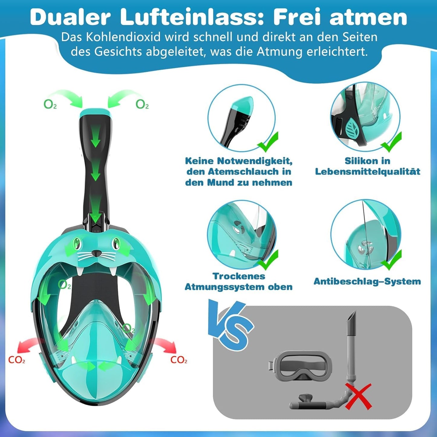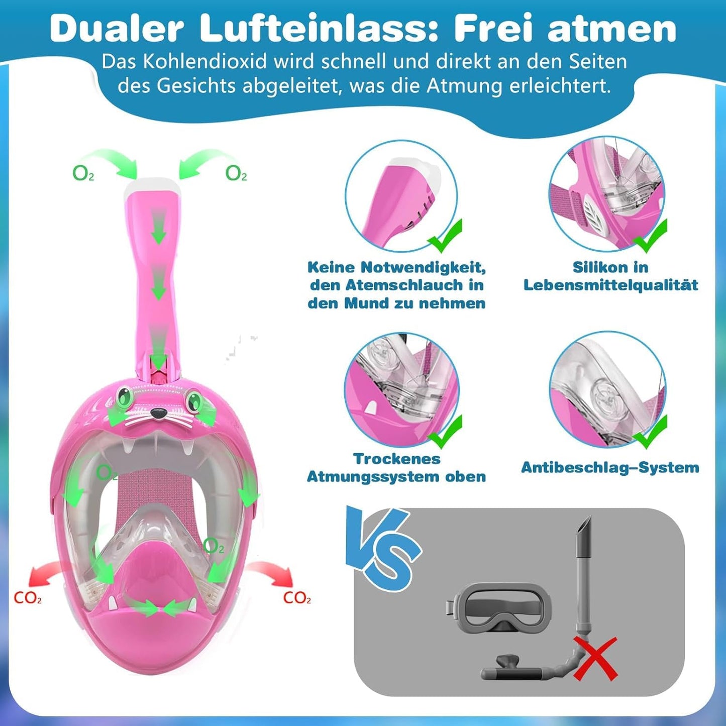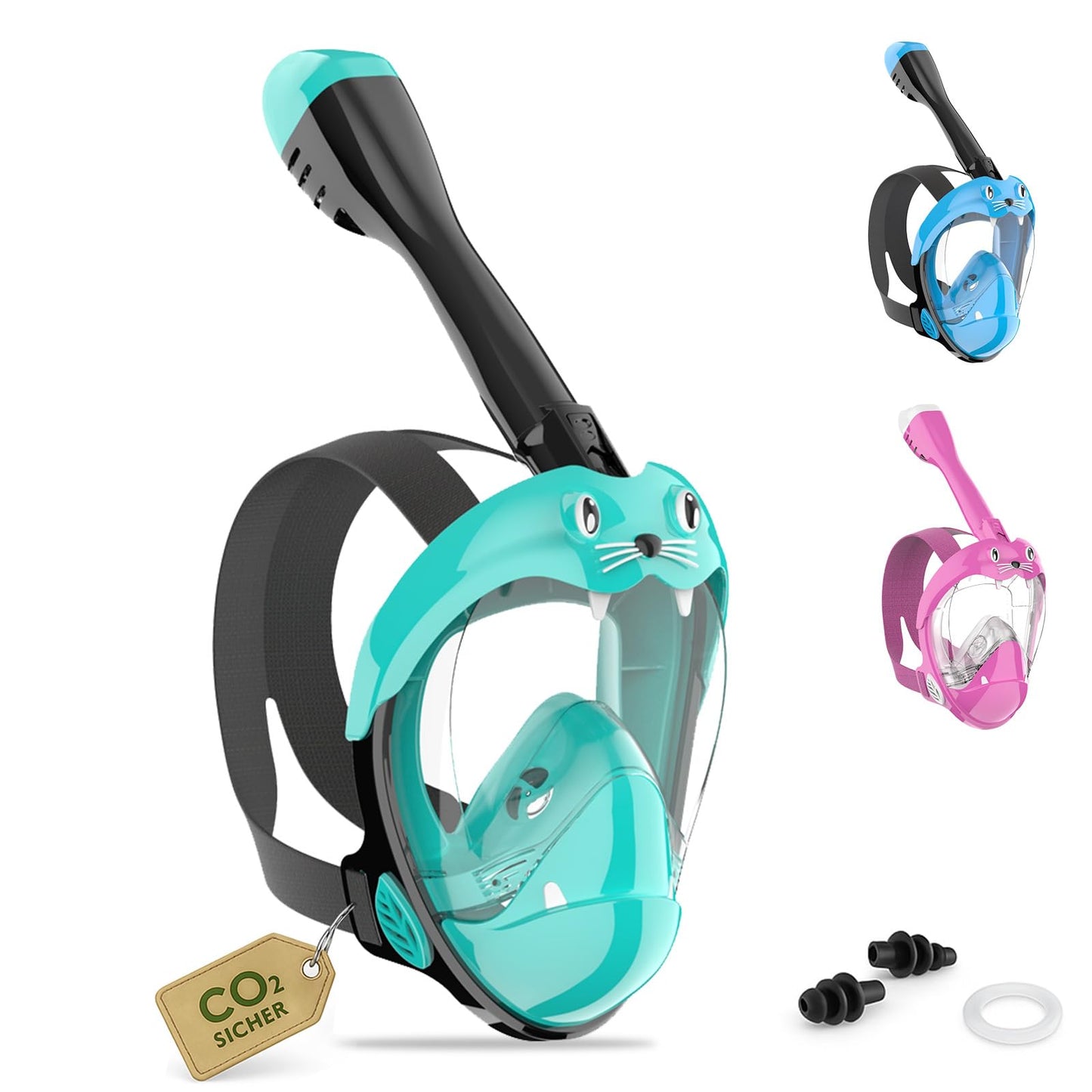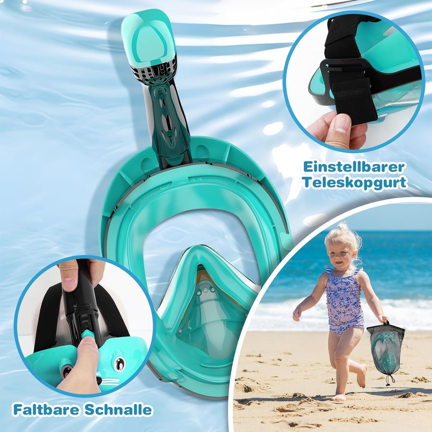 Schnorchelmaske Kinder Vollmaske – CO₂ sichere Tauchmaske ab 6 Jahren mit Anti-Beschlag, Anti-Leck, 180° Sichtfeld – Schnorchel Vollgesichtsmaske inkl. Silikon & Tragetasche