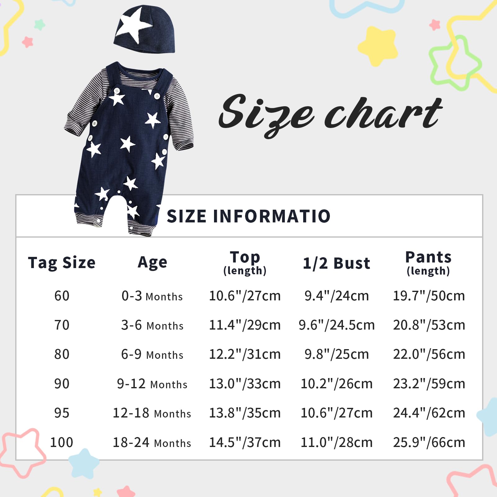 • Gifts: The cute 3 piece baby clothes are the perfect gift choice. The set includes a cute striped T-shirt, jumpsuit and hat.