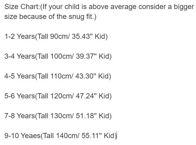 Size Chart: (If your child is above average, consider a larger size because of the tight fit.)