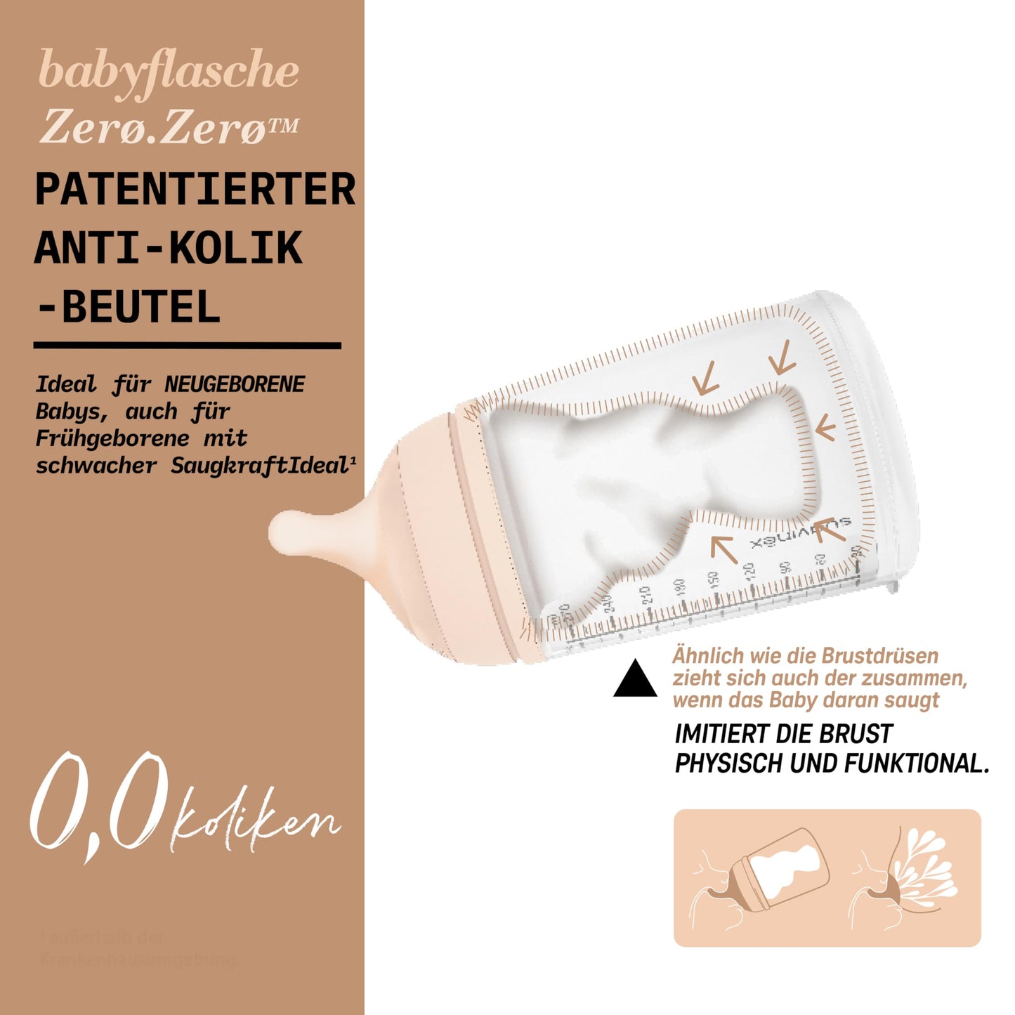 Zero Zero Anti-Kolik-Flasche mit Medium Flow Sauger (M). Die Zero Zero Babyflasche reproduziert physiologisch die Milchdrüsen beim Saugen. Diese Flasche ist das Ergebnis einfacher Naturbeobachtung und zeichnet sich durch ihr patentiertes Anti-Kolik-Taschensystem aus. Wenn das Baby saugt, zieht sich der Sack zurück, genau wie die Milchdrüsen. Dies beugt nicht nur Blähungen und Reflux vor, sondern verhindert auch, dass Luft die Milch oxidiert und die darin enthaltenen Nährstoffe zerstört.