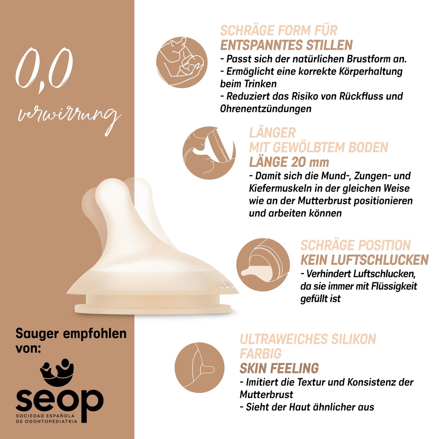 - ULTRA-WEICHER SILIKON-SAUGER - Skin Feeling. Ahmt Form, Länge und Berührung des mütterlichen Brustwarzennach. Mit seitlicher Position, um Luftaufnahme zu vermeiden. Geneigt, um die natürliche Krümmung der Brust zu respektieren
