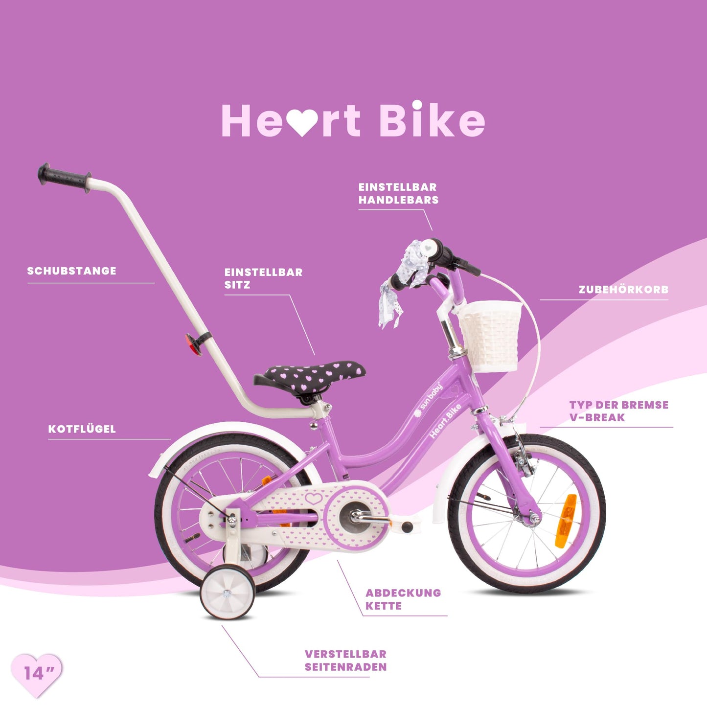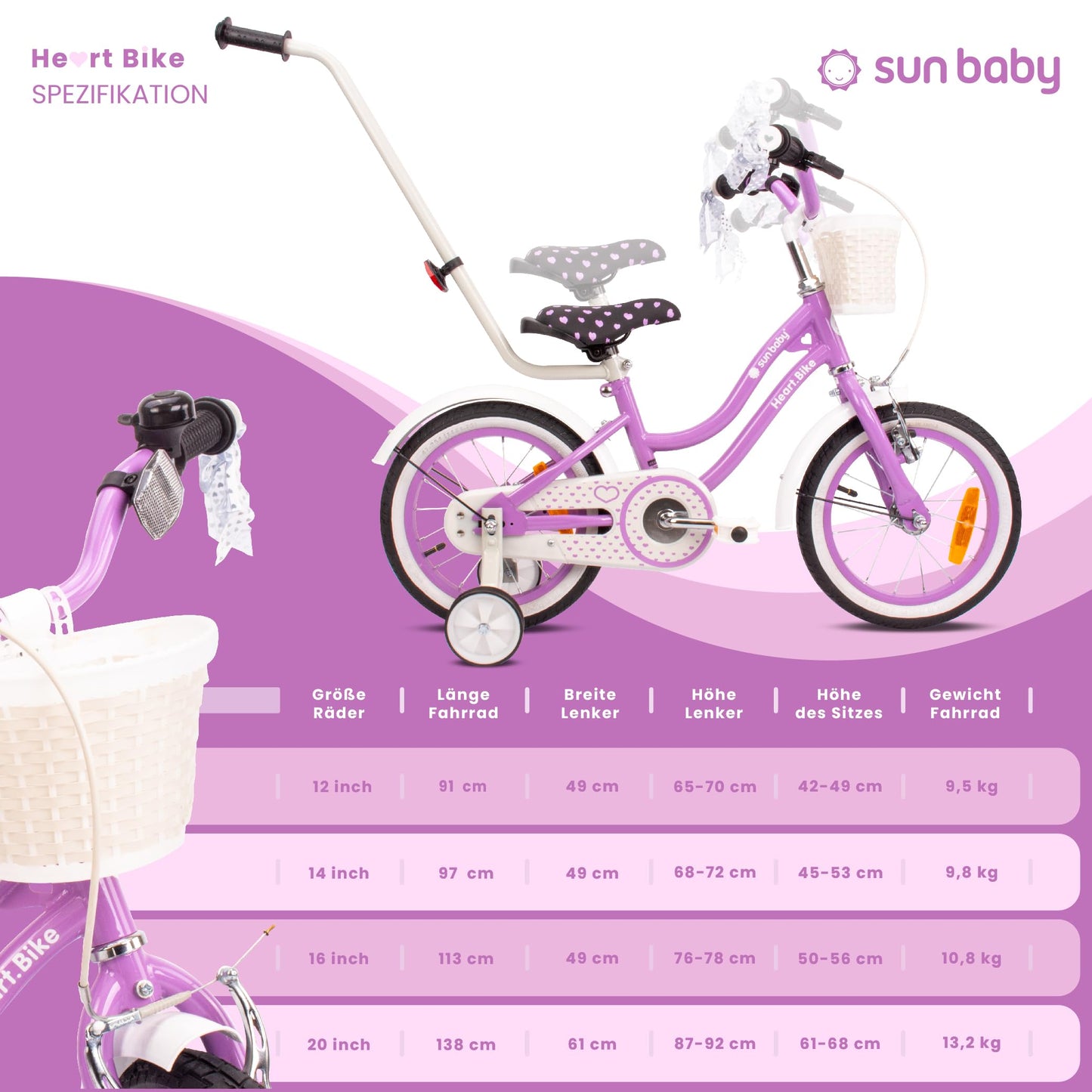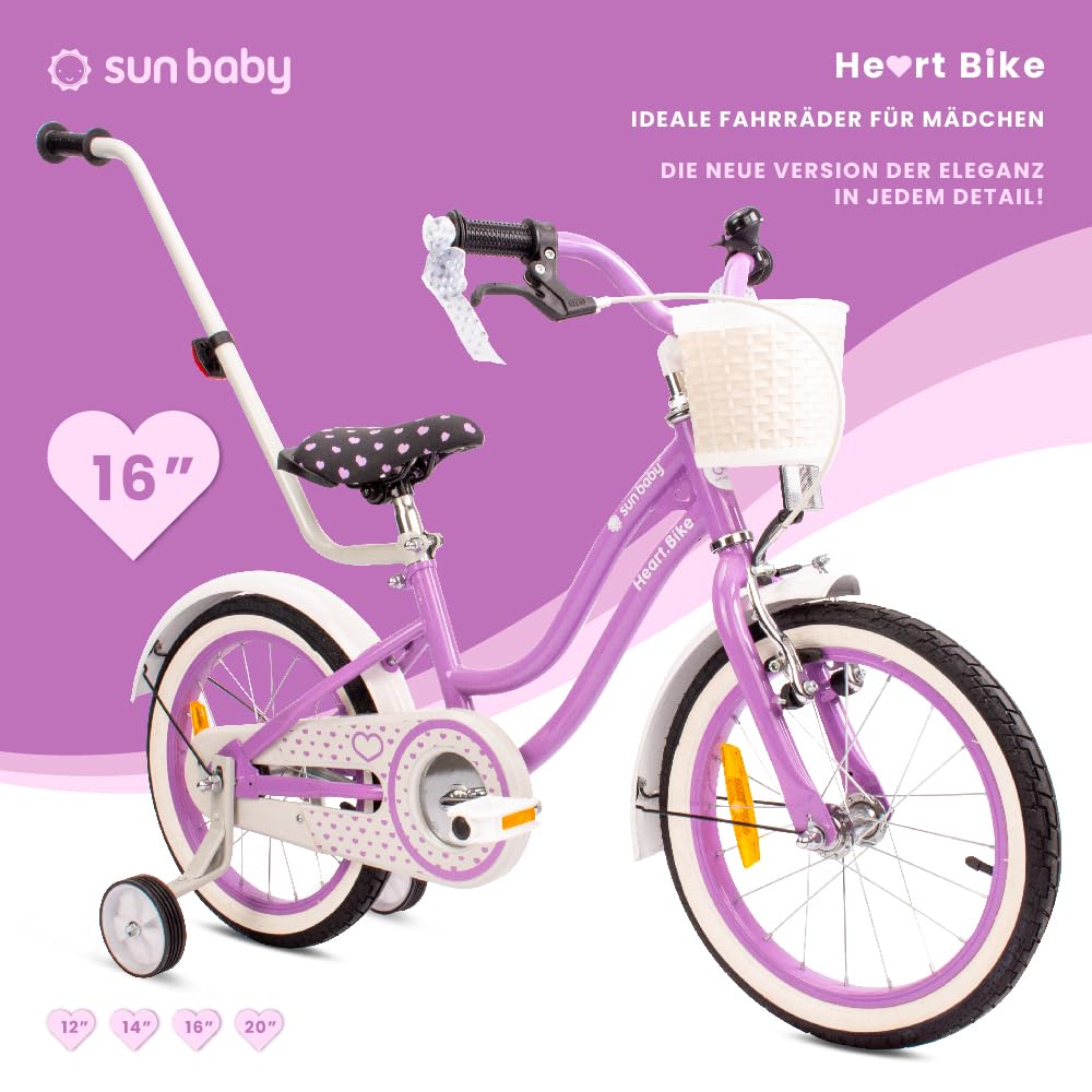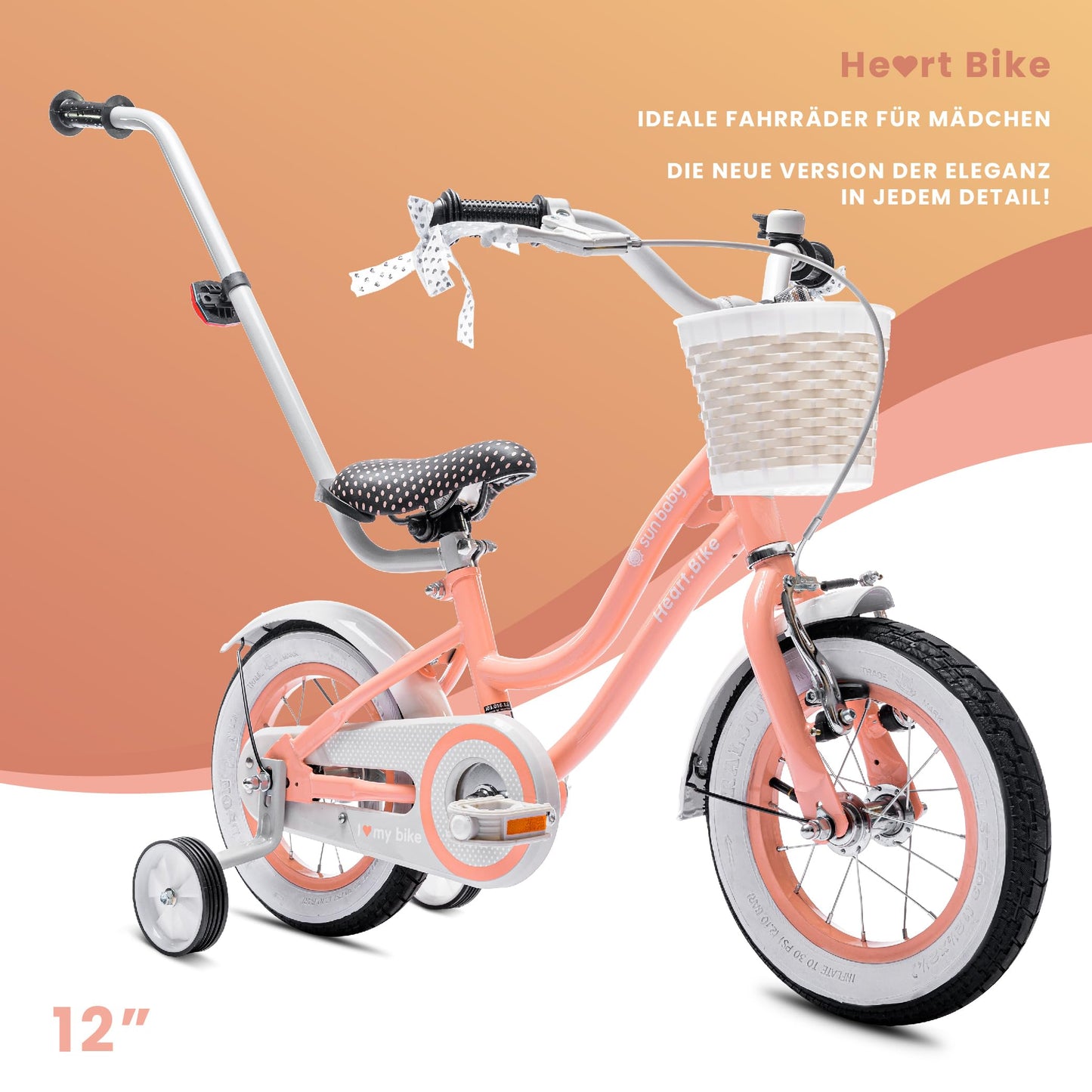 sun baby Mädchenfahrrad 12, 14 und 16 Zoll Radgröße Heart Bike zur Auswahl, mit Abnehmbarer Schubstange, Kinderfahrrad für Mädchen von 2 bis 6 Jahre