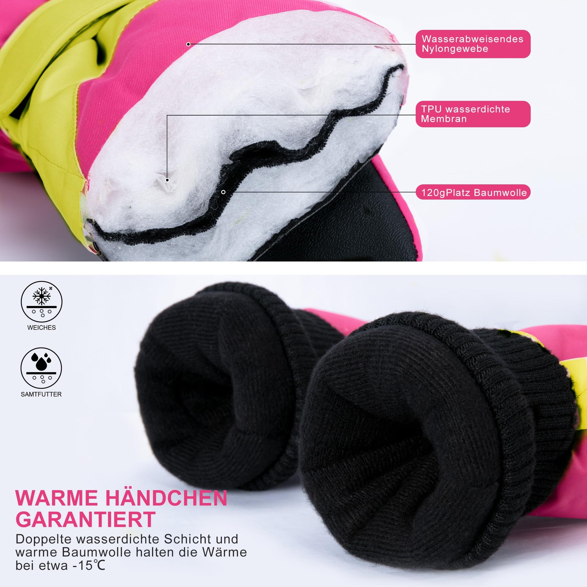 • ❄️ COMPREHENSIVE WINDPROOF & WARM: 3.6 cm long knitted cuffs can prevent snow and cold wind from entering while not strangling the wrist. The Velcro fastener can tighten the cuffs, prevent the gloves from falling off easily and prevent cold wind from entering. Children can play and train more comfortably.